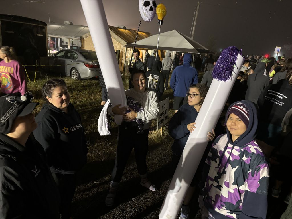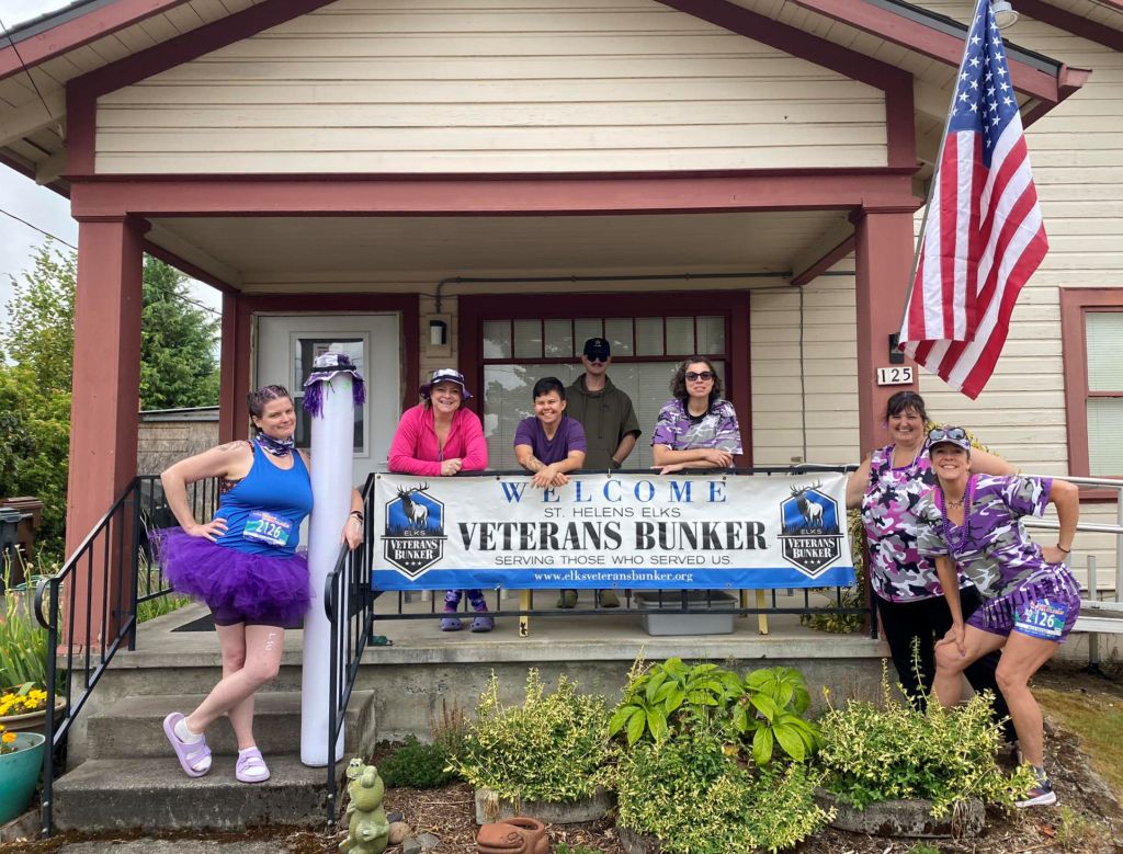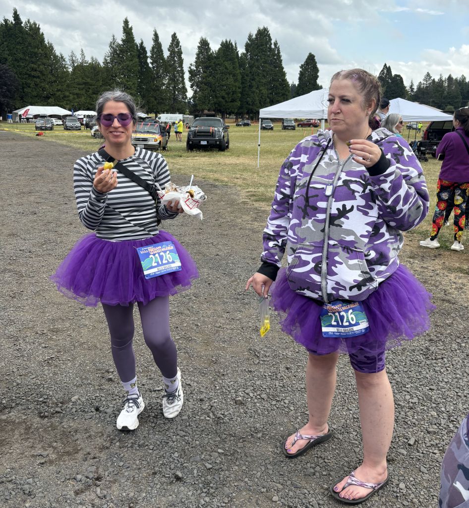As you have noticed, we are glaringly purple-themed. Since we’re all veterans, we chose the purple camouflage, and then anything else purple we can wear, like purple shoes and purple earrings and purple tutus. (Even the van driver wears purple!) Many of the other teams have their own themes, and there is often an element of humor.