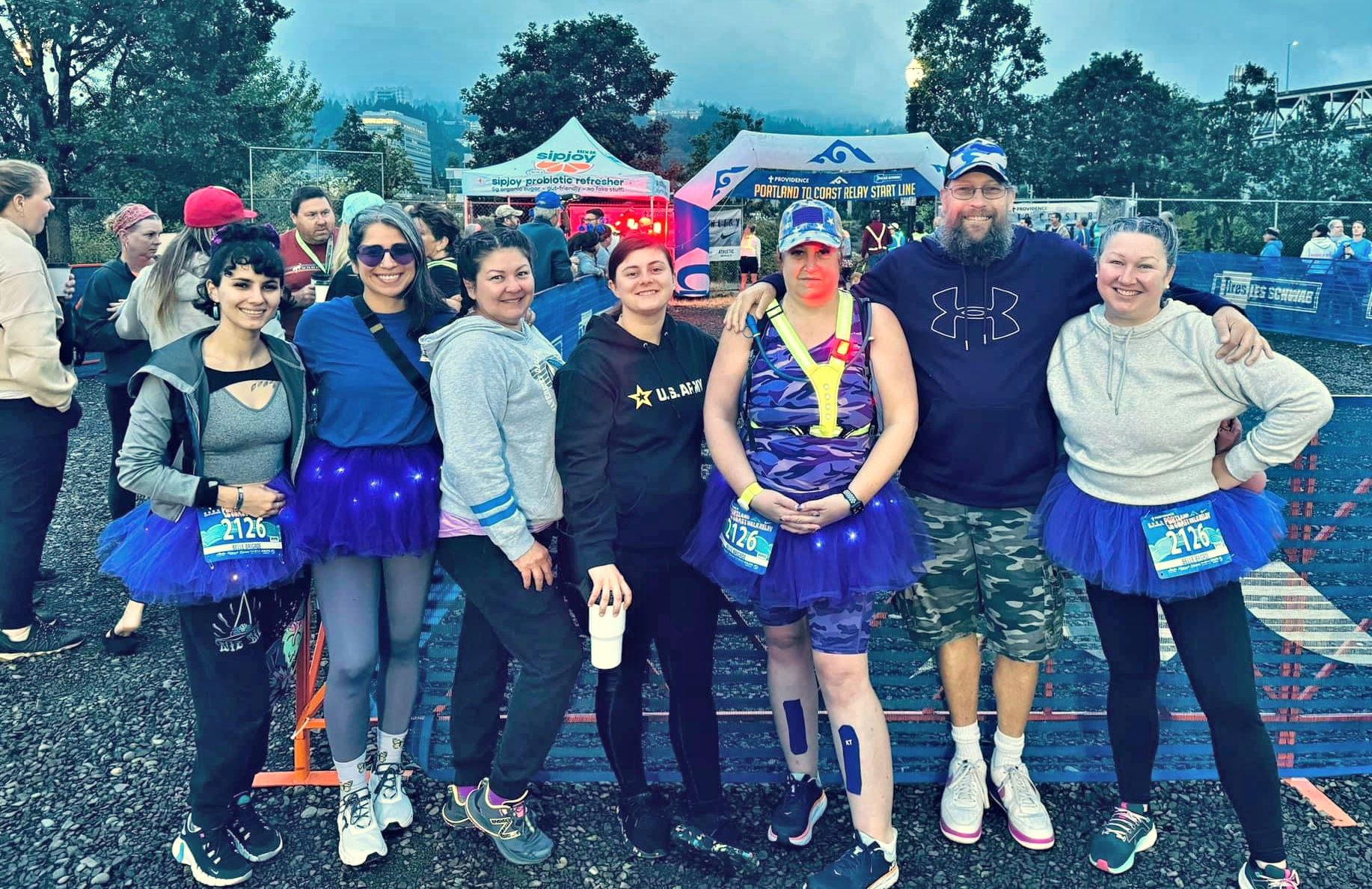 Because everyone else you meet is having a blast and you realize you are too. Everyone is laughing in line at the foul porta potties, at each other’s funny team names and great van decorations, at each other’s yawning tired faces, and crazy messy hair and smeared makeup, and at 14 layers of clothes because we didn’t realize how cold it would get and didn’t bring a jacket. It’s a shared event of myriad miseries, like the military itself actually, and it’s those kinds of events that bond people to each other.