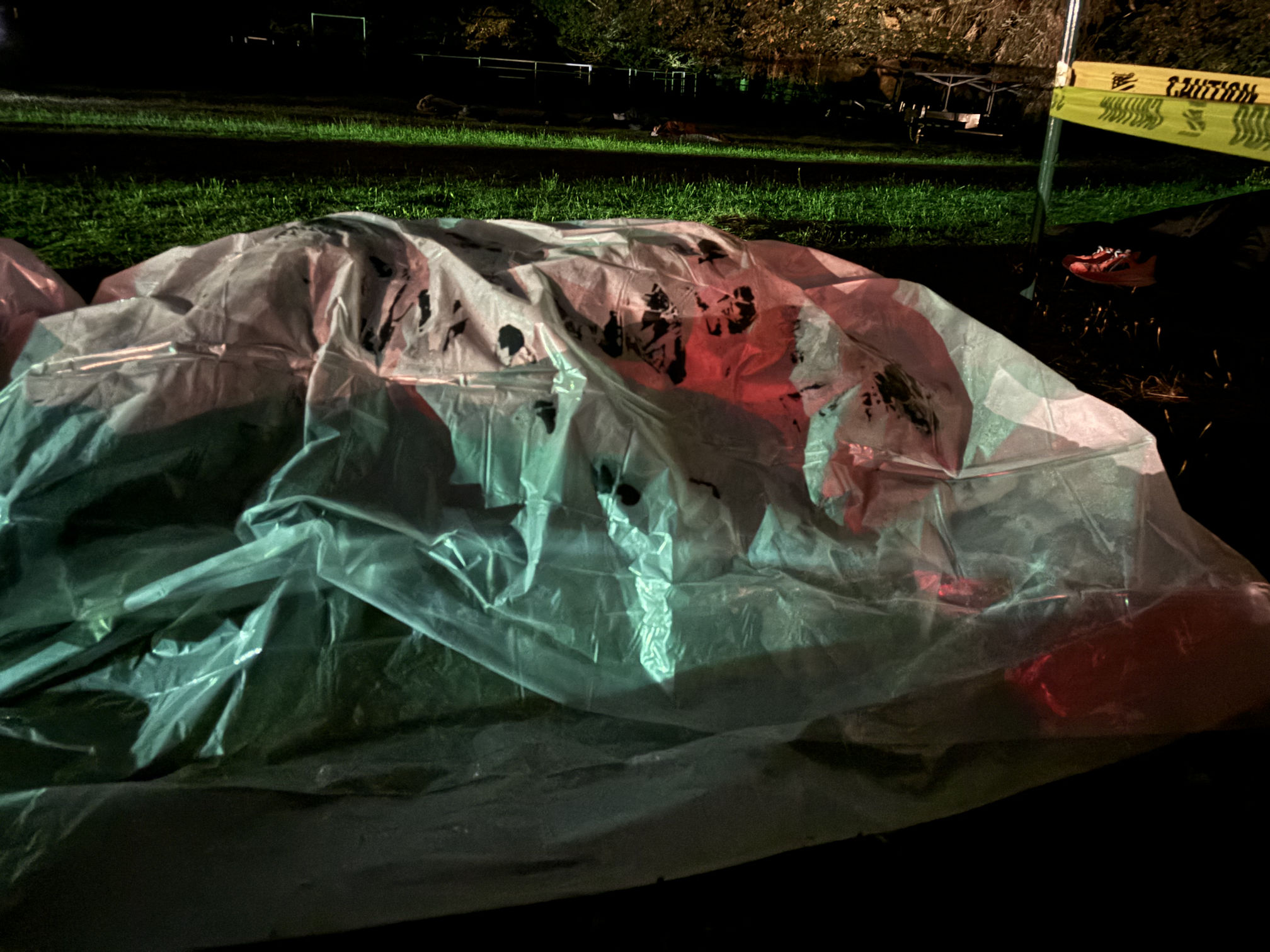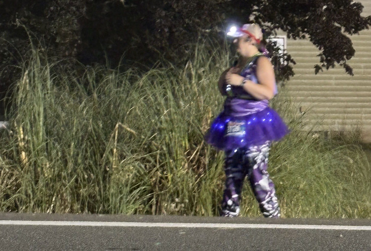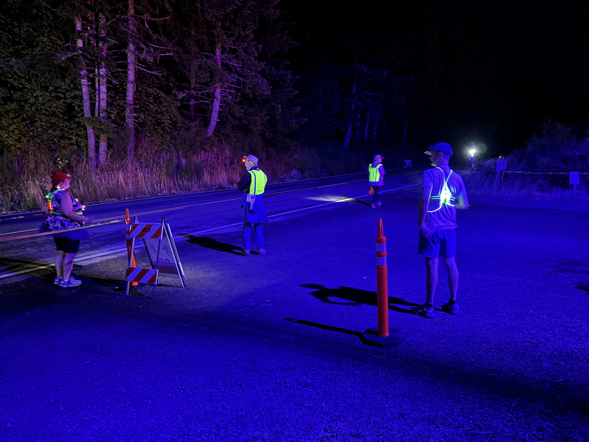 The next time we handed off to the other van, it was total darkness. Now, imagine a wide field of grasses and blackberry bushes holding a thousand team vans and many thousands of people. Imagine that it is the middle of the night and raining, and you have to park your van and begin wandering through the sopping wet grass, shielding your eyes from the rain and the glaring headlamps that everyone wears, looking for another van with purple stuff on it. It’s madness.