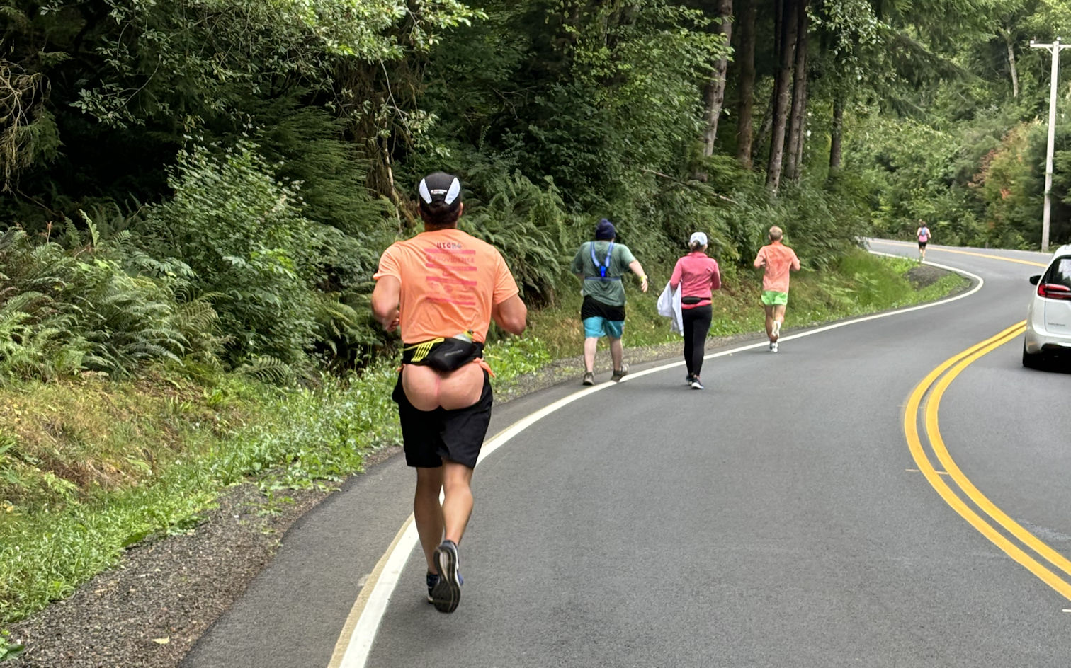 Van 1 starts us off, at the Oregon Museum of Science and Industry (OMSI), beside the Willamette River in Portland. Each woman speed walks her segment, which is from 3.5 miles to nearly 8 miles long (depends on terrain and safe places to put exchange points), then hands off a slap bracelet to the next woman. (I’m saying “woman,” but one person on our team is non-binary. They told me it’s ok to keep referring to it as an all-woman team.) When the sixth woman finishes her leg of the race, she slaps the bracelet onto the wrist of the first woman on Van 2, and then all the ladies in Van 1 go eat and rest for about 7-8 hours, till it’s time to take over again.