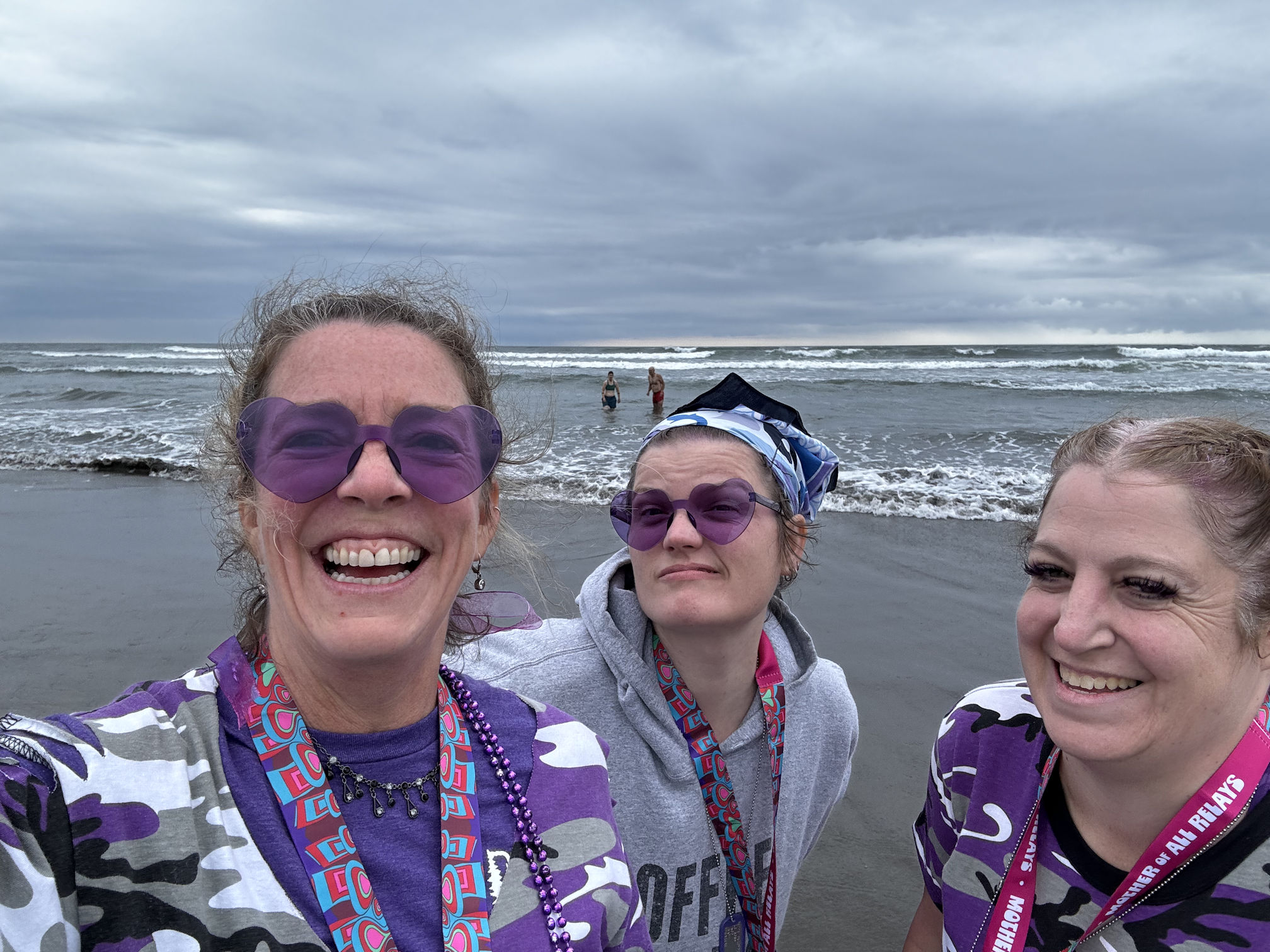 The finish line is in the middle of a humongous beach party, with not only the thousands of participants, but their thousands of supporters. It is madness, and not many on our team are interested in joining them while we are exhausted. We usually make our way through them all, and off to the beach. Because, the ocean is right there and we want to touch it!