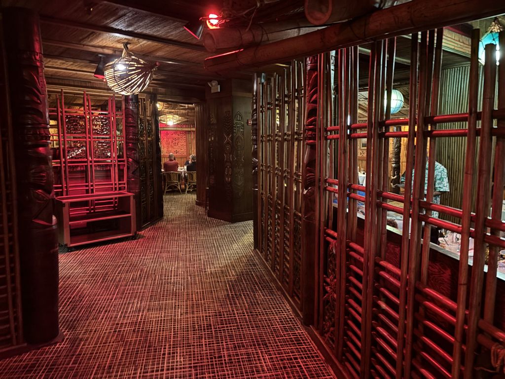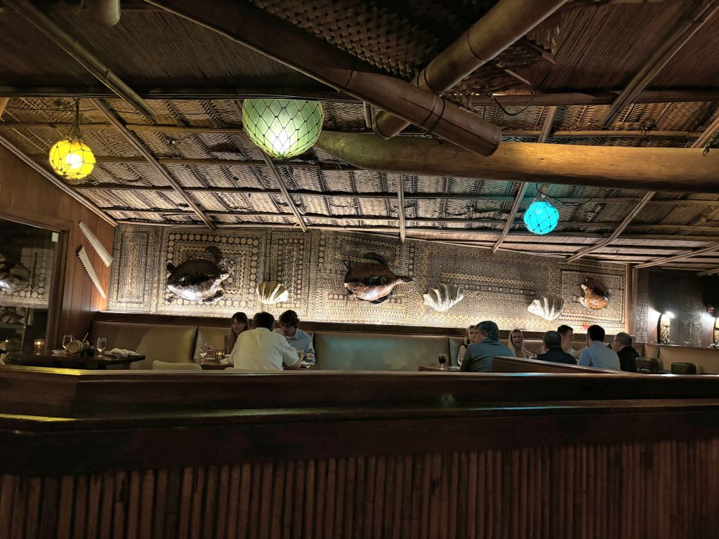 Back in 1934 Vic “The Trader” Bergeron opened a bar that eventually morphed into a Tiki themed fusion bar with an emphasis on rums and specialty international rum drinks. In the 1950s and 1960s, this Tiki style became a fad, and Vic expanded his restaurants and bars to 25 or so, including one in London. Then the popularity waned and locations became uncool and many were closed. This particular location is in the Hilton and was opened in 1976. Though the collection of decor is often stylized and stereotyped and mixes cultures, I enjoyed it for representing a fad from my Grandparents’ time.