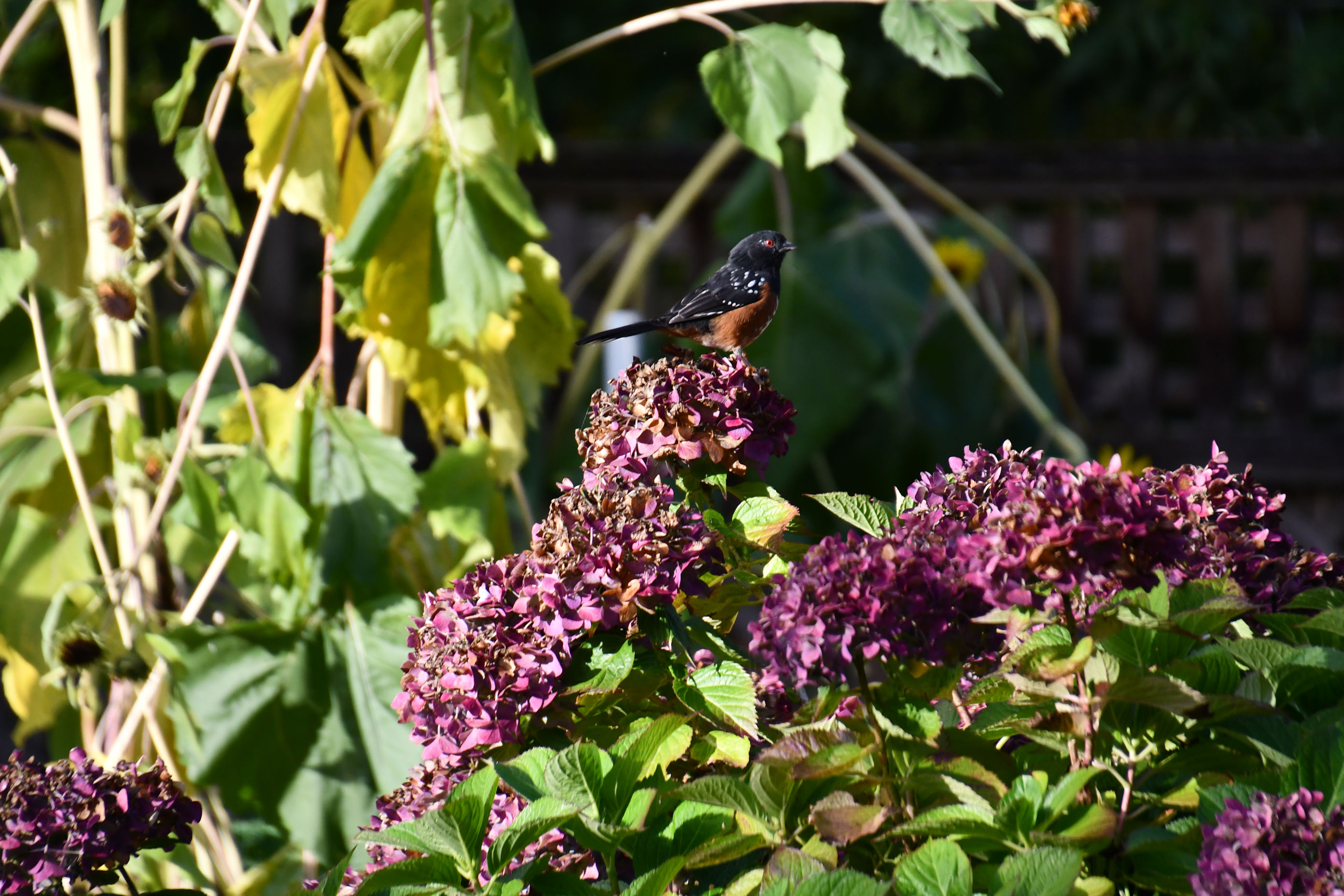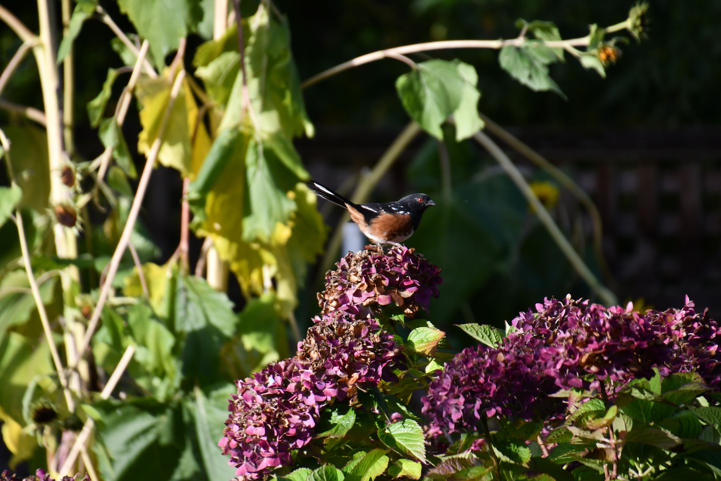 She’s perched on my hydrangeas, which were blue-purple in the summer, but have turned the richest plum, just like they did last year. I wonder what is in the soil right there. And the yellowing sunflowers are wilting behind her. And her russet vest and deep red eyes with a black jacket and white speckles. Such a handsome one.