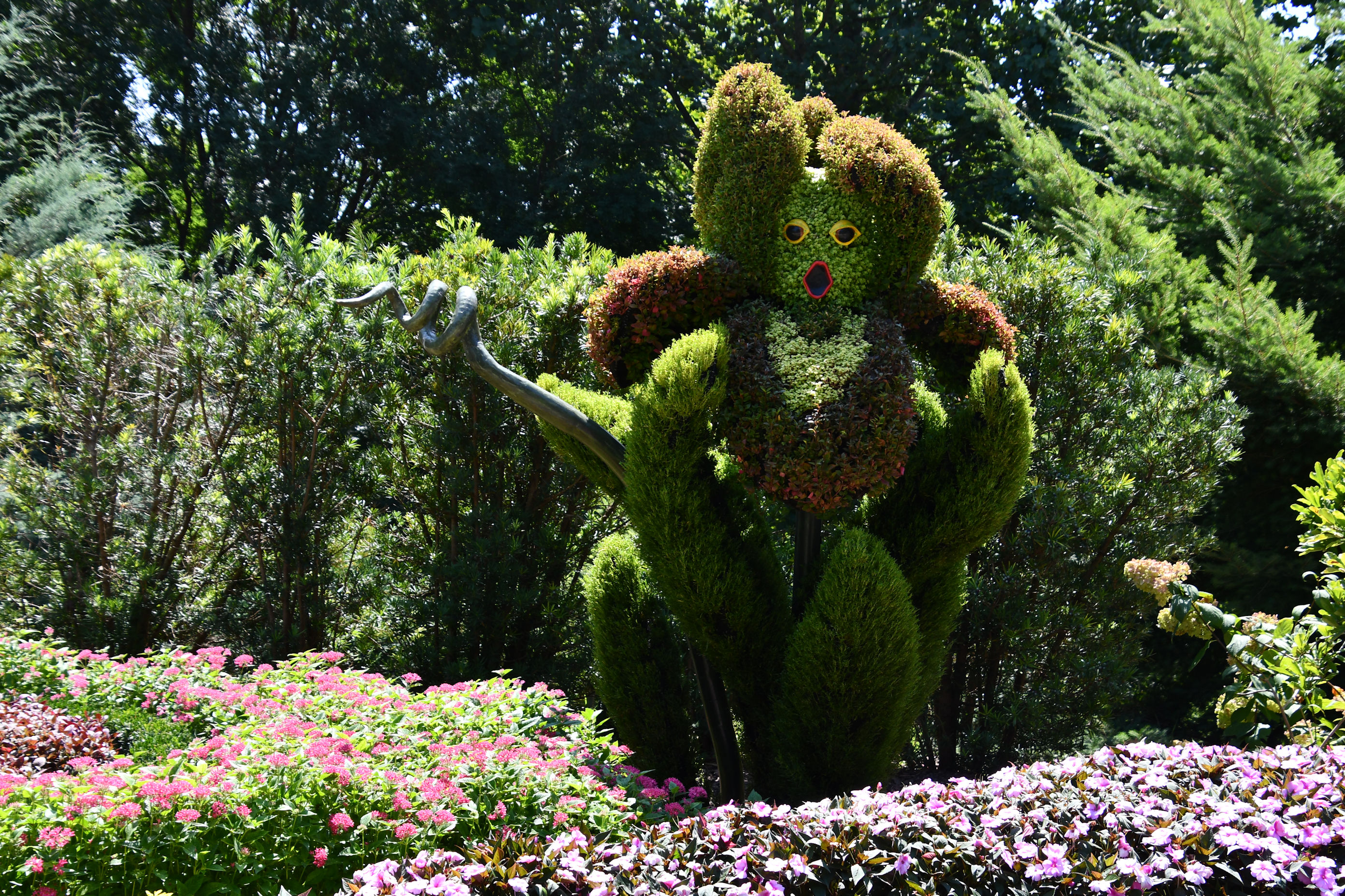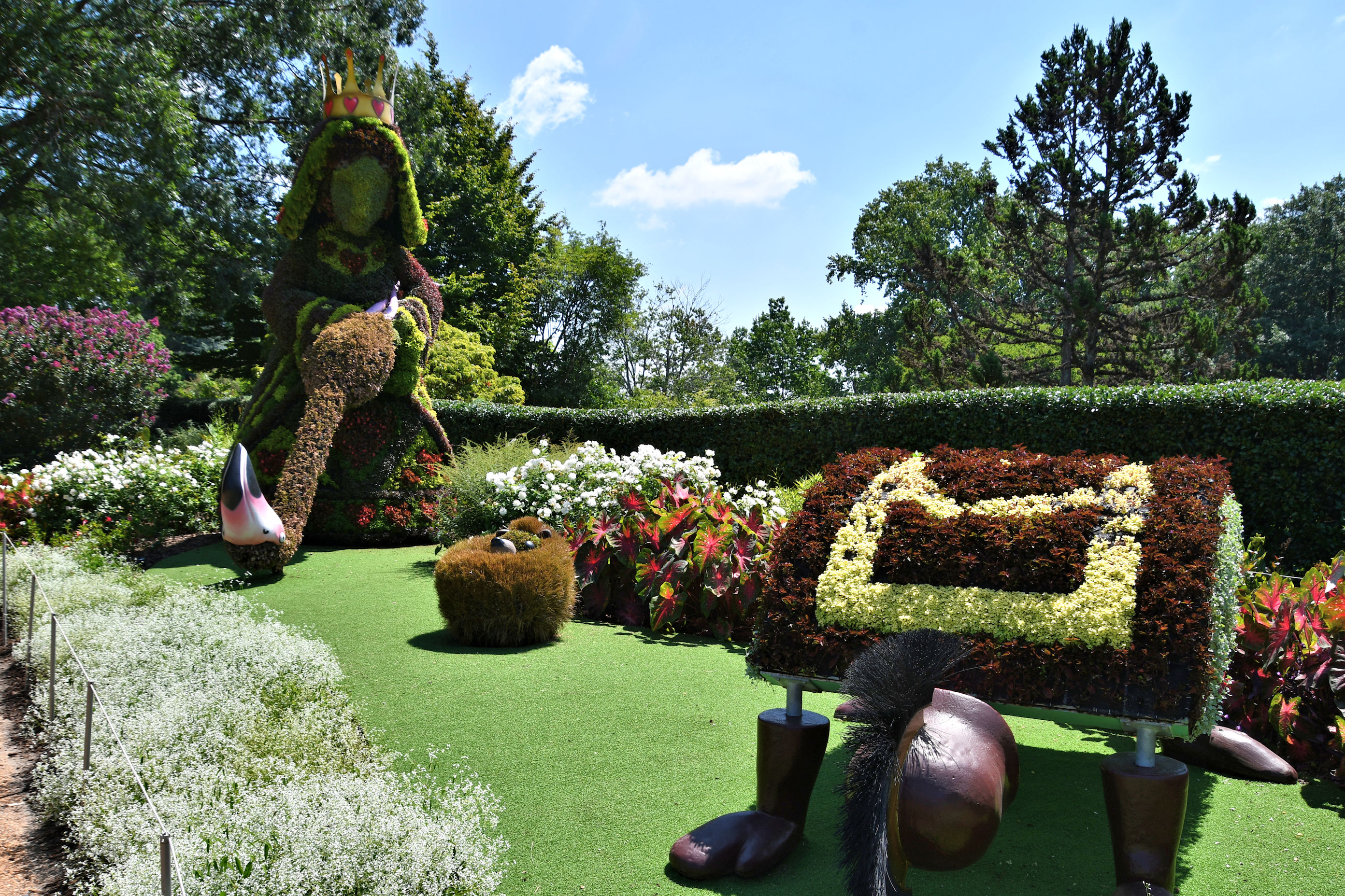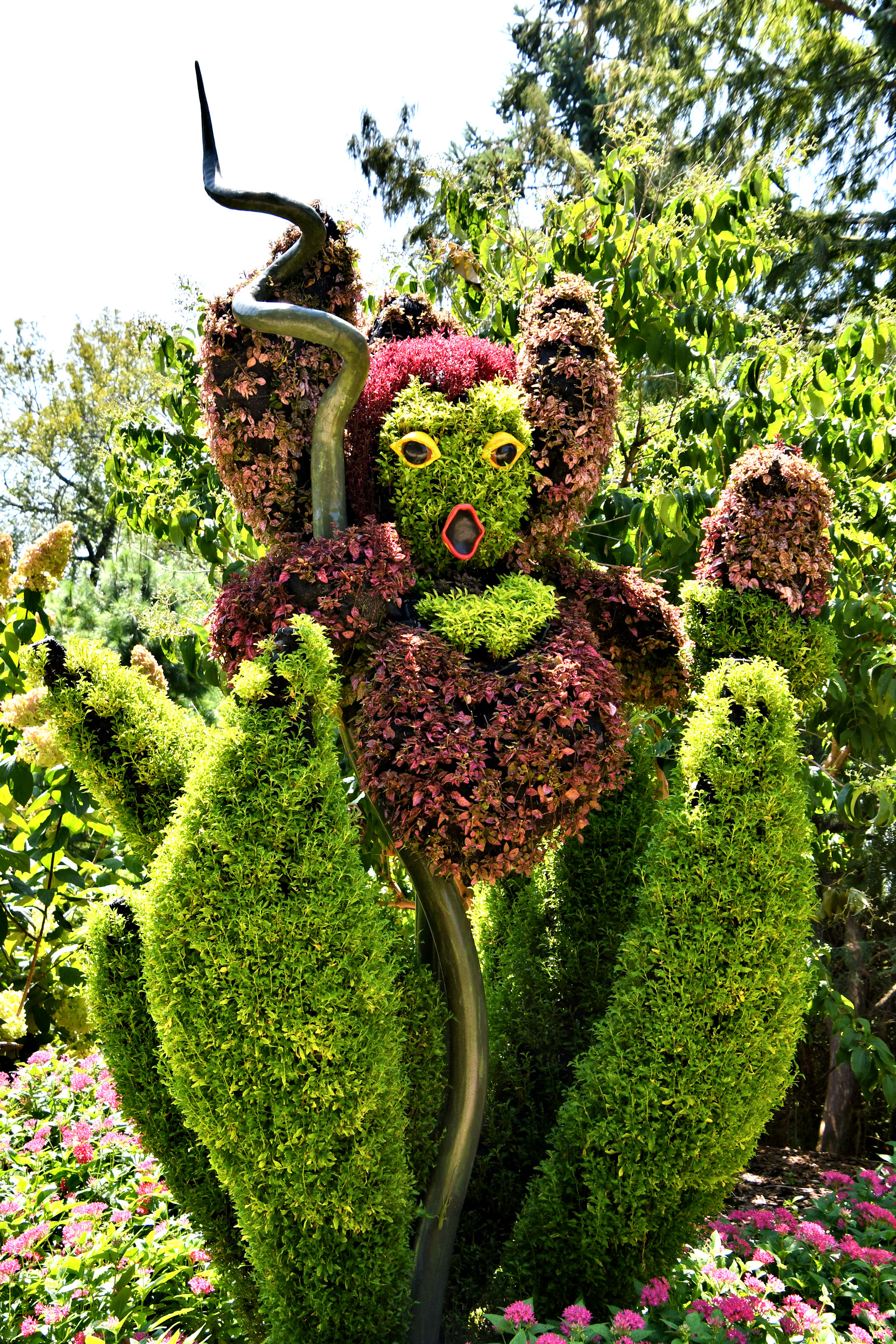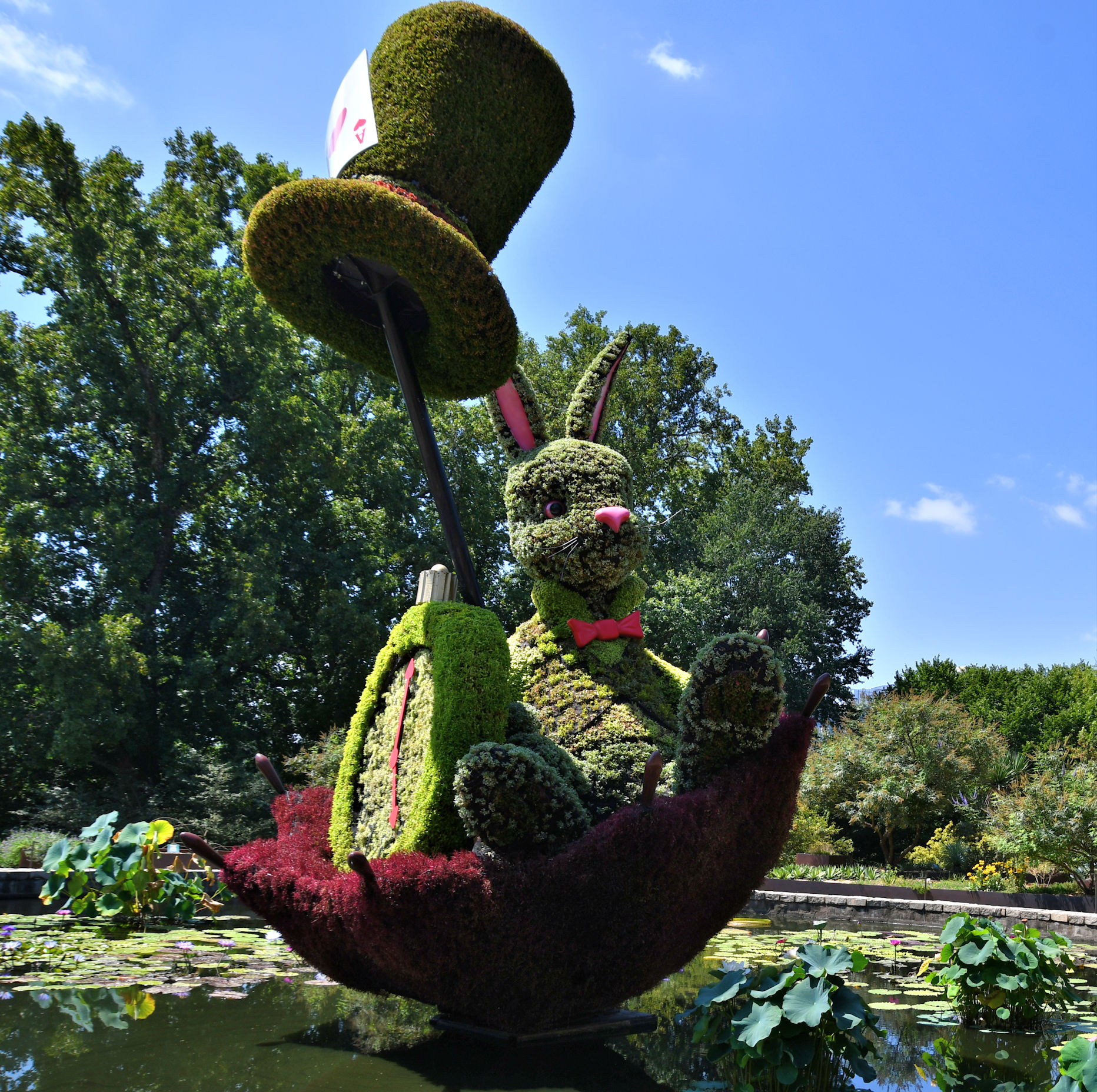 The botanical garden was featuring “mosaiculture,” a type of gardening that looks like topiary, but is really thousands of small plants placed over steel structures. These are all living plants, and must be cared for, fed and watered and trimmed. The theme was Alice’s Wonderland Returns, so you will recognize many characters, as we did.