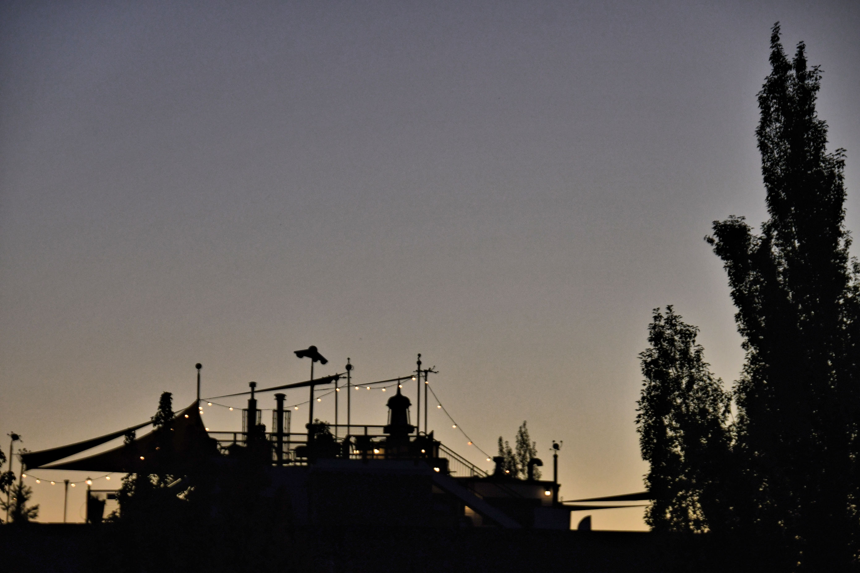 We were hungry again, though, so we decided to eat at the restaurant that Kellen and I had been to in May. We walked only two blocks to 1882 Grille. We were met at the front door by a smiling woman who apologized and said their ground floor restaurant was closed, and the only option was the rooftop bar! How perfect!! We went upstairs and had a simply excellent meal with fabulous staff who were happy to be there, provided full service on the warm night, and made us feel cared for. We glanced over the tops of buildings and spotted the McMenamin’s rooftop bar, dark and empty, except for a string of lights.