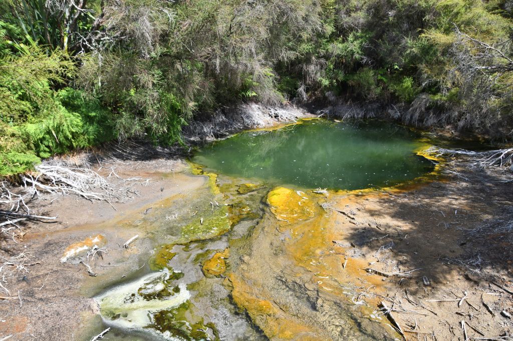 We continued to Rotorua and checked into our hotel in the afternoon. Though Pedro and I were suffering from sunburns, and it was a warm day, we had enough energy to check out a nearby geothermal park. We lathered up in sunscreen and walked in shade when we could.