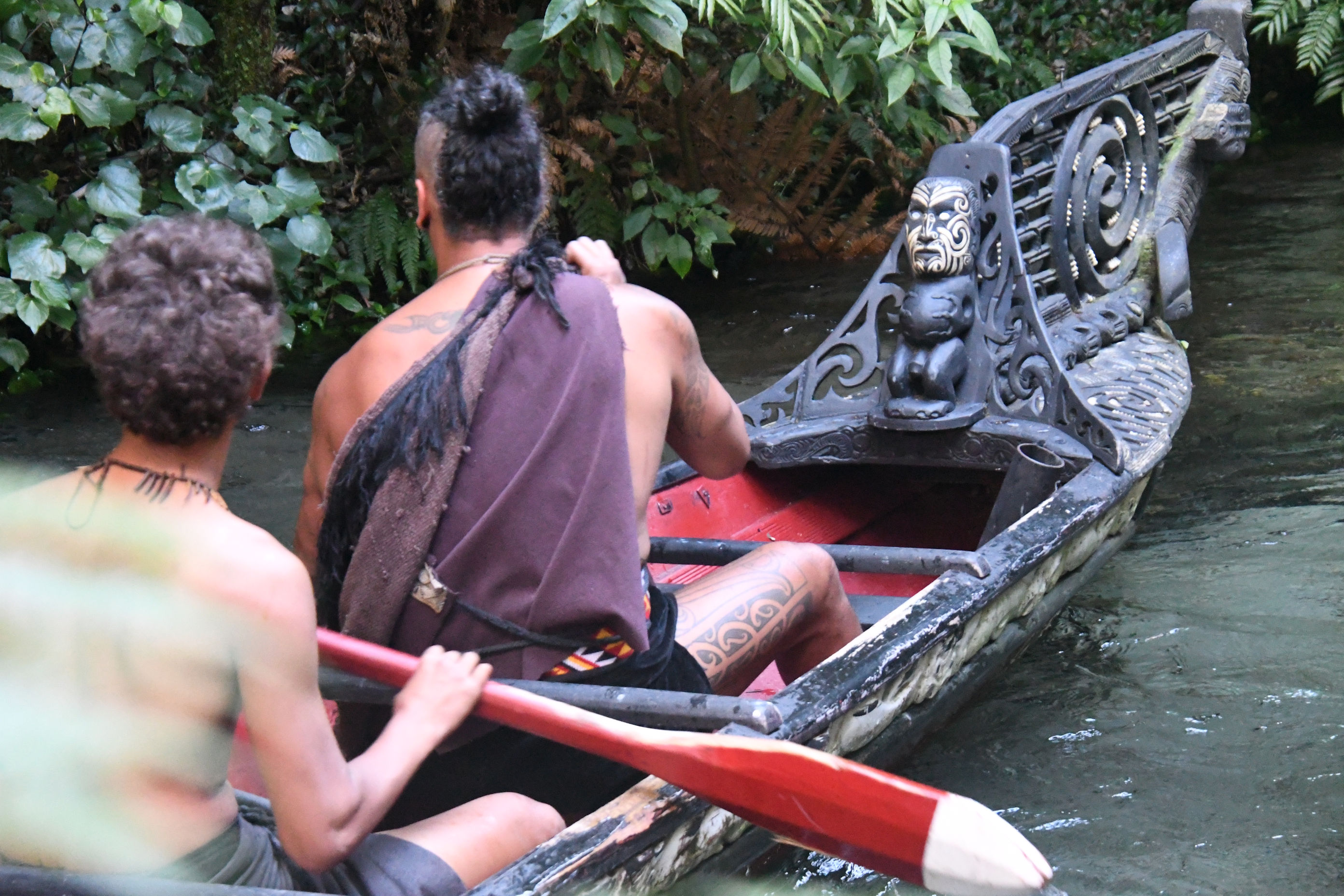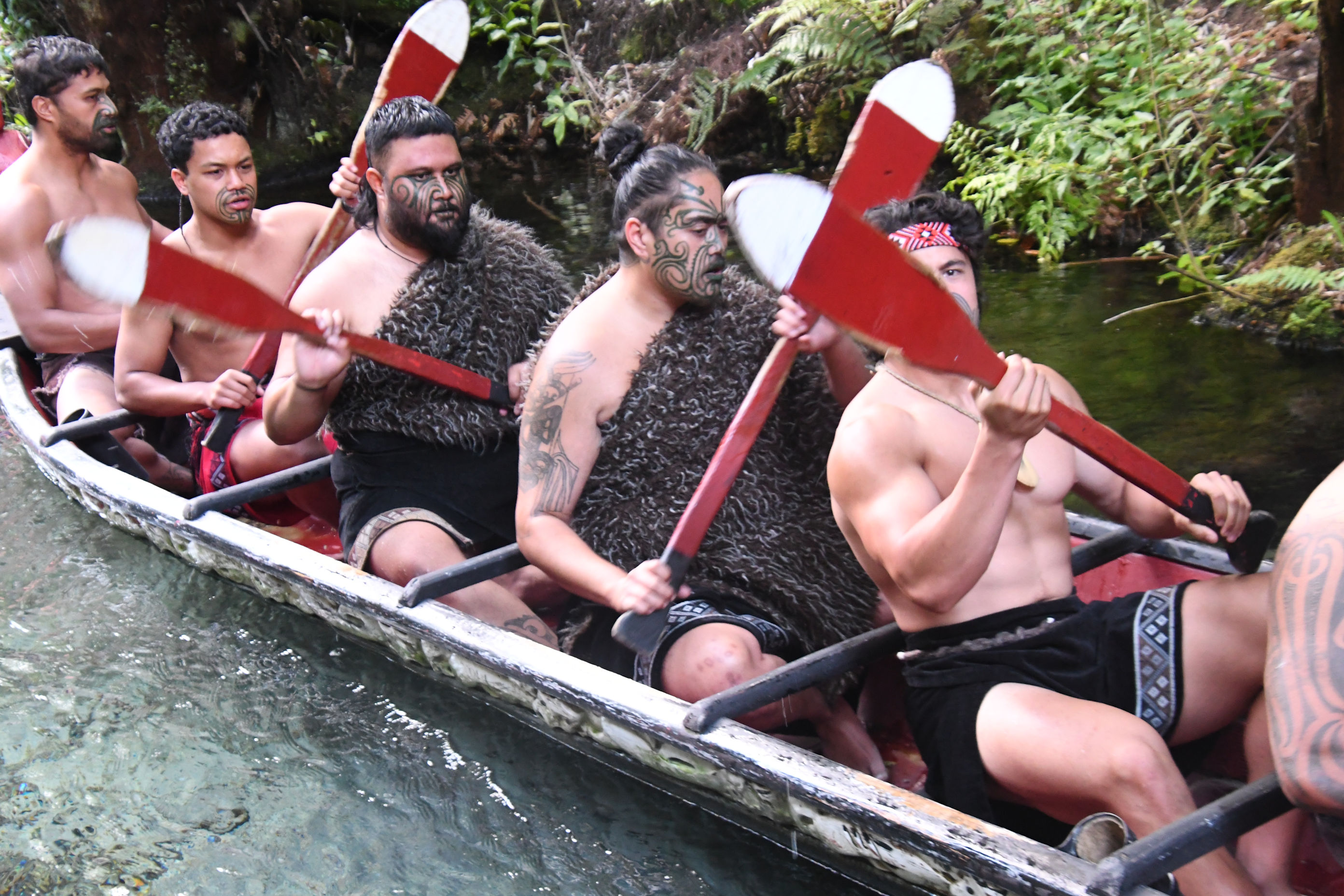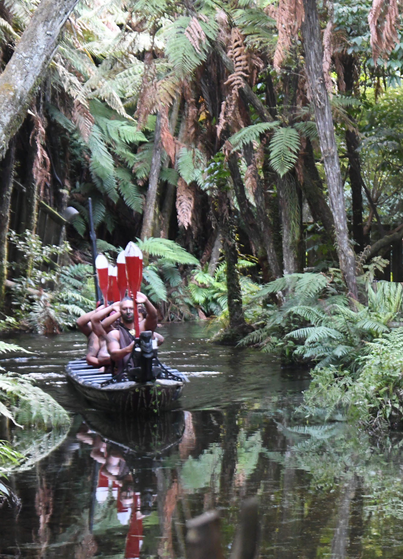 We all lined up on both sides of the stream, then waited. A canoe came along the waterway, with Maori warriors in it. They paddled the water and also swung their paddles in the air and sang for us. The wide eyes and tongues out are part of the demonstration, designed to intimidate any challengers.