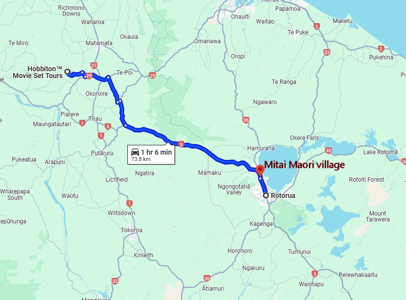 Our trip this afternoon from Hobbiton to the hotel in Rotorua, then a tiny backtrack to the Mitai Village.