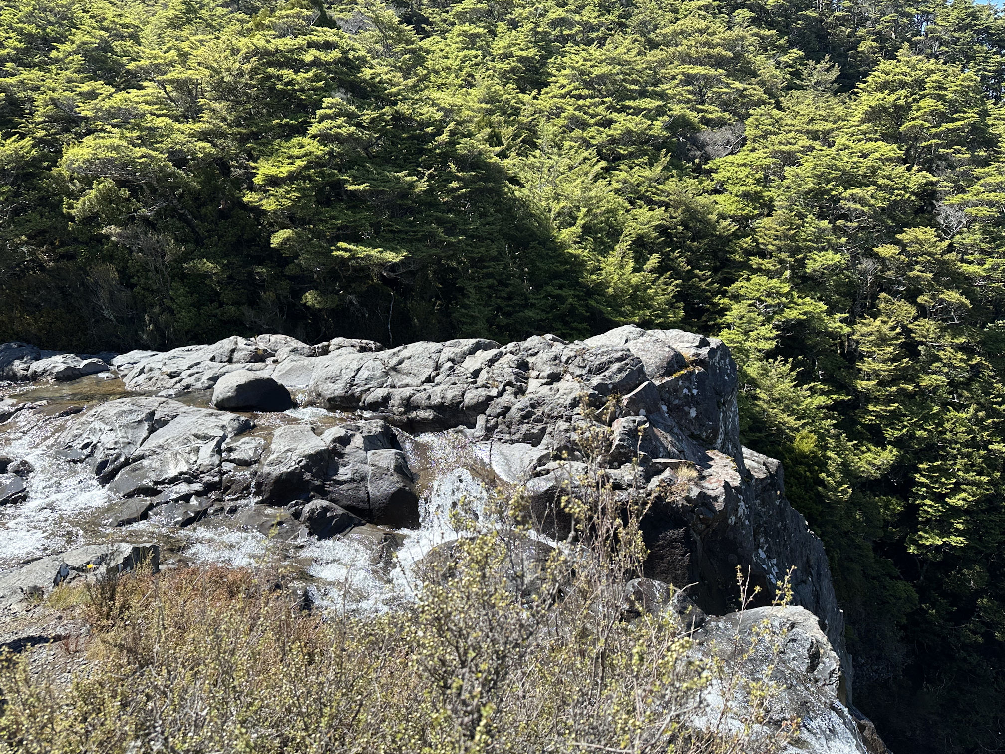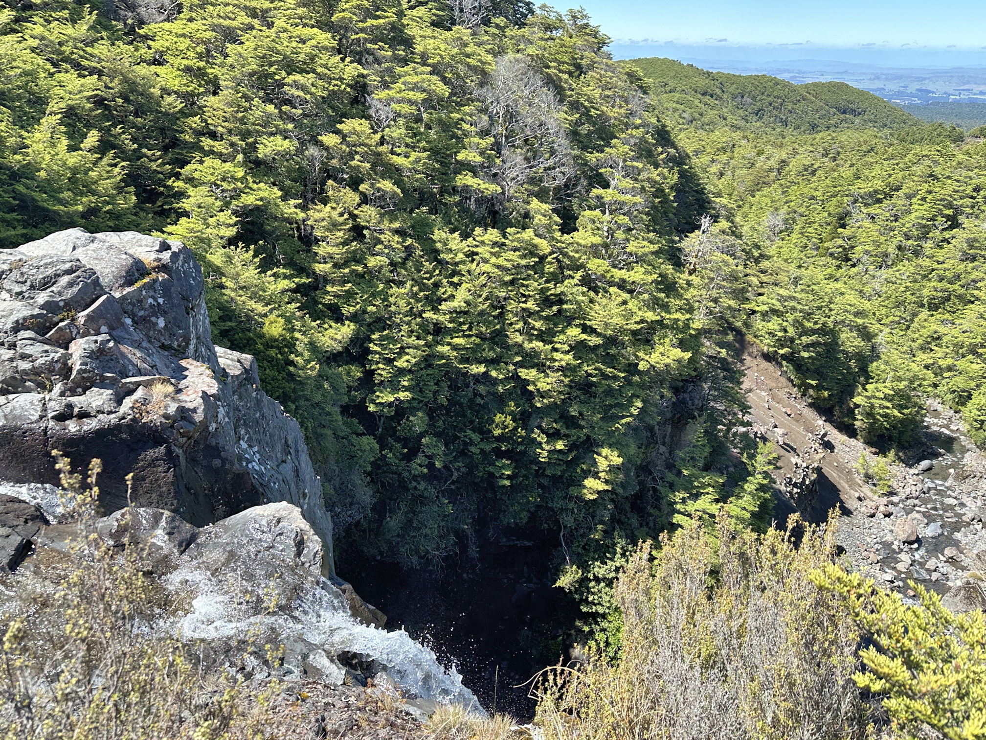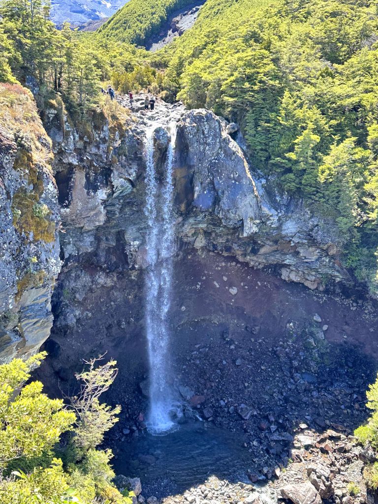 Pedro and I got curious and wandered off down the trail, leaving the reenactors to their thing. The trail led to a view of Mangawhero Falls, on the side of Mt. Ruapehu.