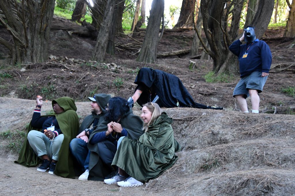 On this occasion, Pedro was interested in participating in the reenactment because he wanted to try on some of the props. If I didn’t mention it earlier, Pedro’s affinities lean more toward the dark characters. He likes the orcs. His favourite character is one with a big role in Rings of Power, that of the elf Adar, Father of Orcs. The piece of kit that he wanted to get his hands on were the gauntlets worn by the Ringwraith. Soon I was over the edge of the hill, getting photos of him in action. In my opinion the scene was rendered ridiculous with the addition of the horse head. (I’m sorry, I’m sorry. I just think the whole reenactment thing is over-the-top silly. But we did try to play along and keep a good spirit about it.)