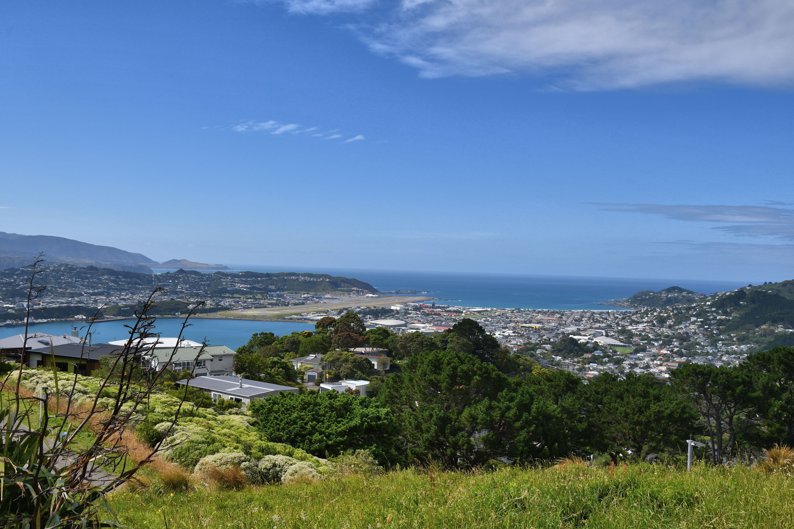 This was the magnificent day and magnificent view we had from Mt. Victoria Lookout. You can see the runway for the Wellington airport, between two bodies of water.