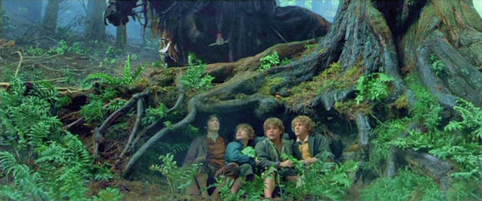 On the edge of the road is another famous movie scene. As the Hobbits are collecting their wits and brushing off their clothes from the tumble, and picking mushrooms, Frodo gets the sense of approaching danger. “Get off the road!” he yells to them, and all four Hobbits leap off the road and hide beneath the root of a tree.