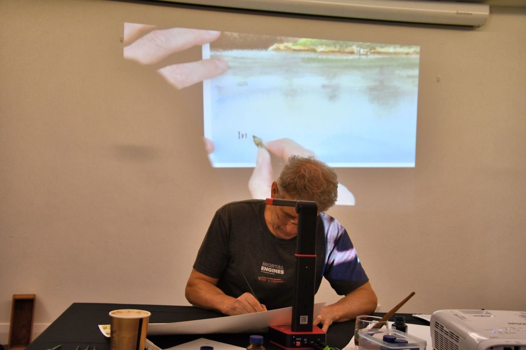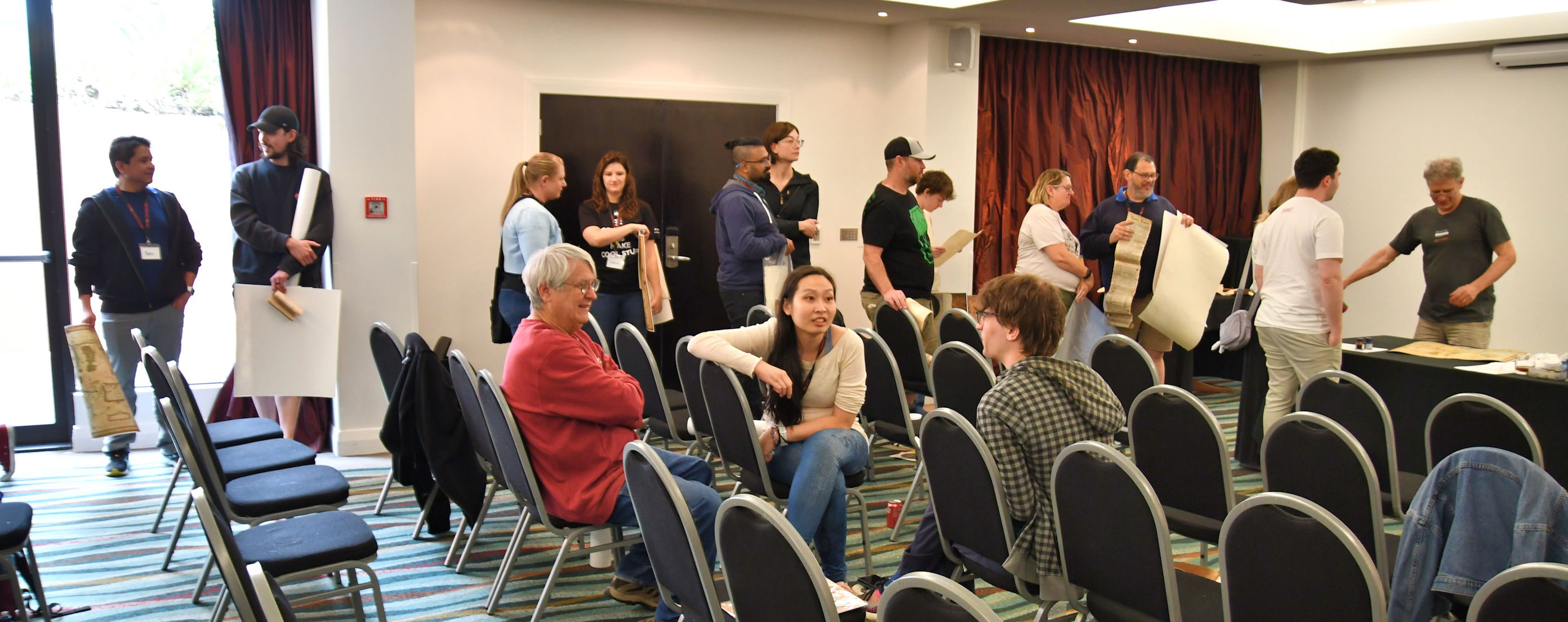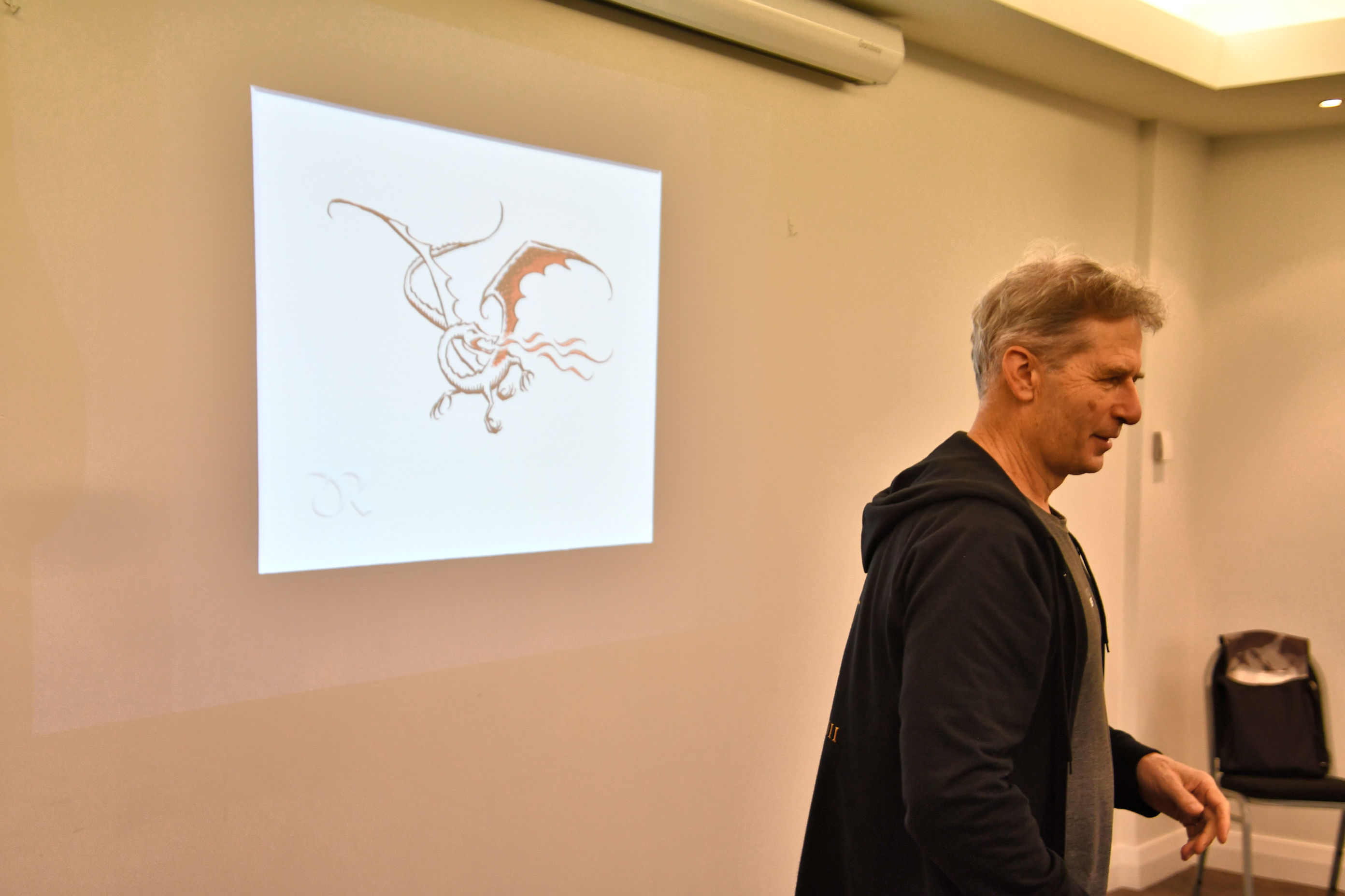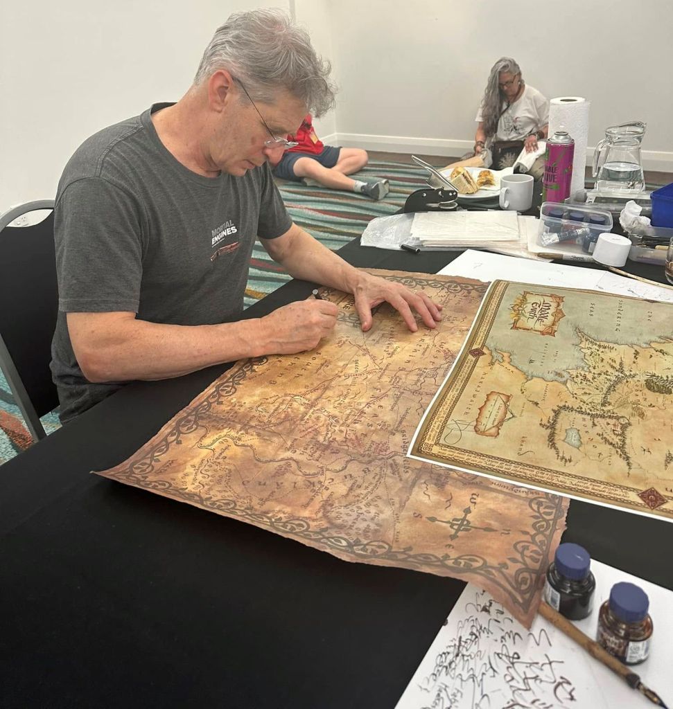 He began by telling his origin story; how he got into this business; how he got involved with movies. He told many stories about how, when Peter Jackson needed something and thought that possibly Daniel Reeve could do it, Mr. Reeve did do it. Usually better than someone else would have. We were asked not to take photos of his main presentation because, like the Weta Workshop, everything he had created for a movie studio now belonged to the movie studio. But afterward, he showed us some of his own work and demonstrated his calligraphy.