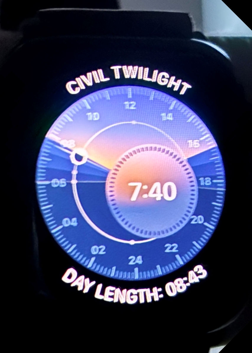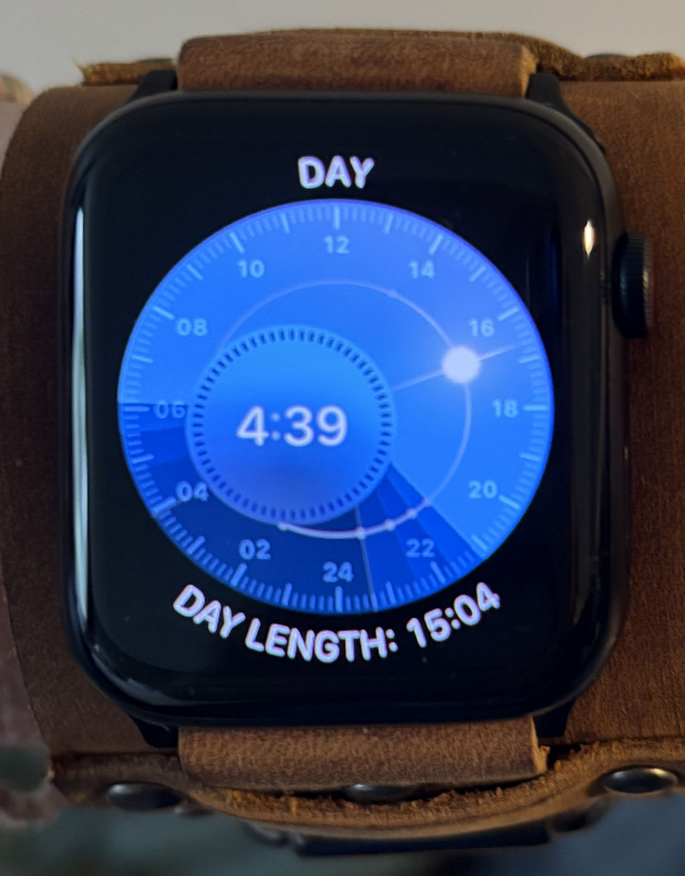 It was summer in New Zealand and we had plenty of daylight left. The days were so long it never ceased to surprise us during the entire two weeks in New Zealand. For Christmas, Pedro gave me a smart watch. I chose a face that displayed a 24-hour clock with brightness matching the time of day, and a measure of the amount of daylight. Because of this watch face, I discovered the most wonderful thing while traveling to the southern hemisphere.