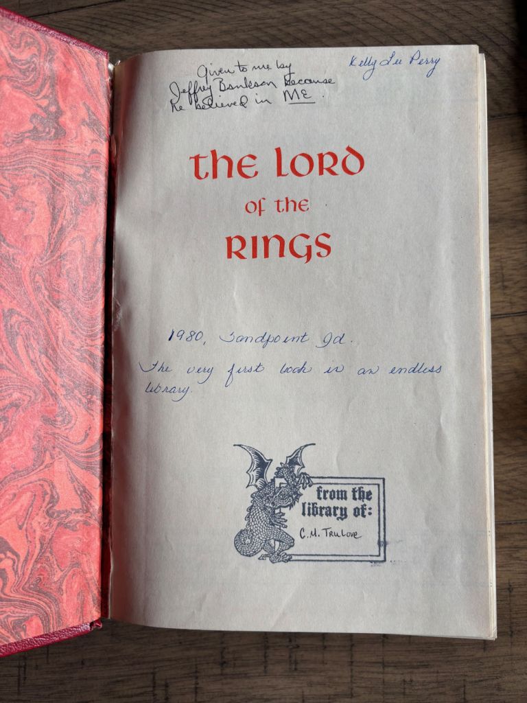 In the image on the right above, is the saddest thing about this book: a torn out page. After I stole the book off Mom’s shelf and moved it to my bedroom, she found it one day. Inside the front page was a page full of handwriting from Mom’s friend Jeffrey. They had a meeting of like minds while both of them were married to other people. They ended up deciding it was too chancy to continue their friendship and still be faithful to their spouses. During their short friendship, Jeffrey had gifted this to her, and wrote an emotional empassioned message about the importance of dreaming and kindred hearts and value of hope and fantasy in the world. That is his writing in the blue, and Mom’s in black. When the book was discovered in my room, though I knew the whole story, Mom couldn’t bear to leave that message from Jeffrey for me to witness – physical proof of her human temptation. Right in front of me, on the spot she tore out the page and crumpled it in her hand. In all the years since, I have wished and wished that I had fished that paper out of the trash and saved it. But Mom heated and cooked with fire in those days, so it’s likely that she burnt it. So sad, huh?