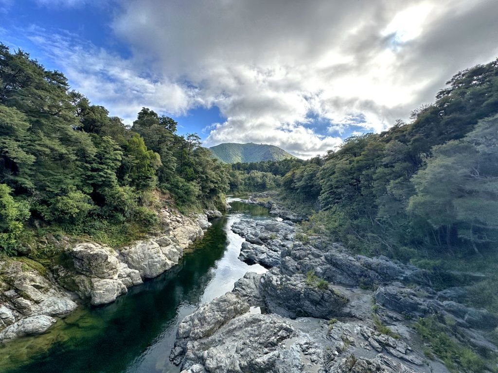 Most people were changed and waiting when we got back. We heard there was a pretty view from the Pelorus Bridge, so Pedro and I ran over there. He got only a couple photos when we were called back to get onto the bus again.
