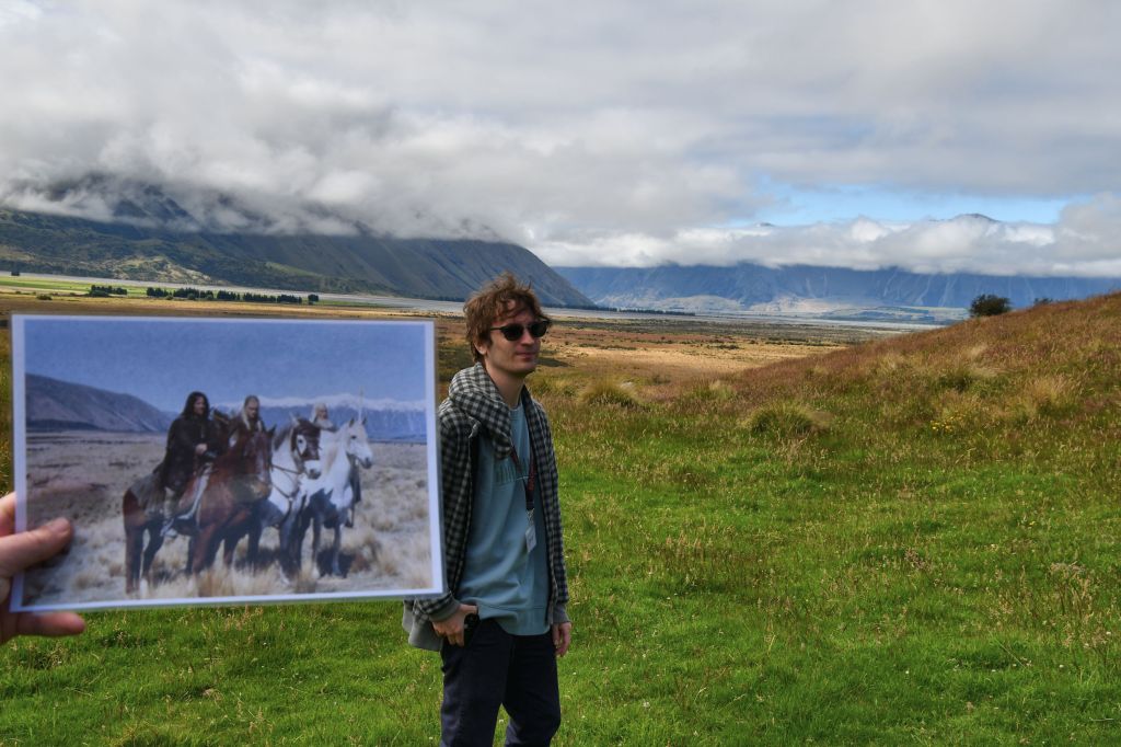 On our very first night in Auckland meeting the tour group, the question was asked at our table: “Which site are you most eager to see?” My answer was Edoras. Of all the landscapes in the movies, the setting of the King’s Golden Hall on top of the hill in a wide, wild valley and surrounded on all sides by snowy peaks….ahhh, it simply makes my heart soar. In the story, the people of Rohan are horse people, so the movie has multiple shots of horses and their riders and the stables which are nicer than all the homes. Every bit of this staging is magnificent for me and I was aching to stand there and be in that setting.