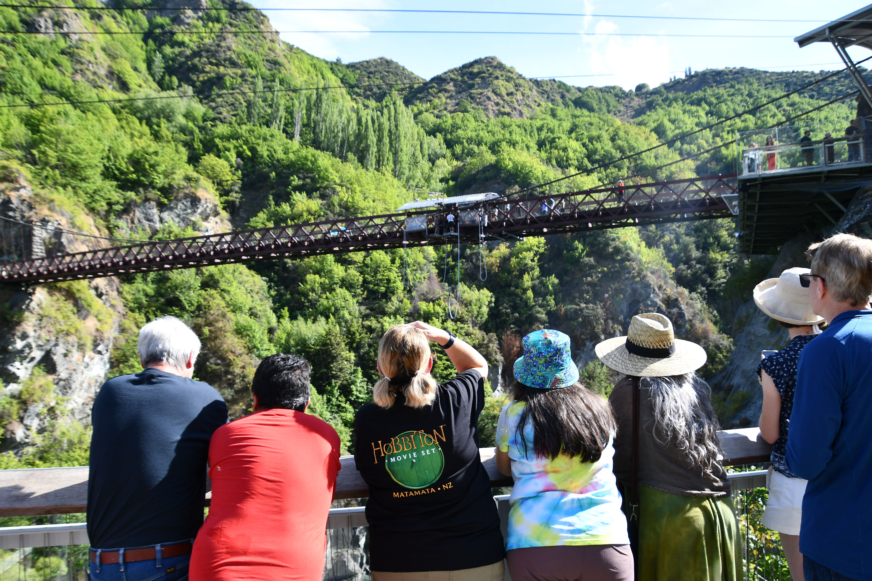 AJ Hackett told Pedro that there were not many people jumping first thing in the morning, so he could go early if he wanted to. He did. A couple other men from the group had decided to jump, and had signed up in the previous day or two, one signed up that morning. But once we were there, the bug hit one more guy so we had a respectable group of jumpers. They all planned what they would yell as they leaped. The ideas were Lord of the Rings themed, like “For Frodo!” and “Fly, you fools!”