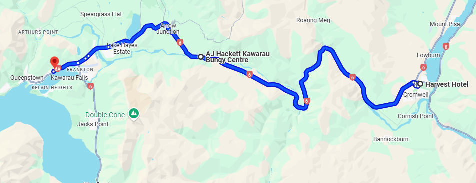 Our short journey that day from Cromwell (right) on Lake Dunstan, to Queenstown (left), on Lake Wakatipu.