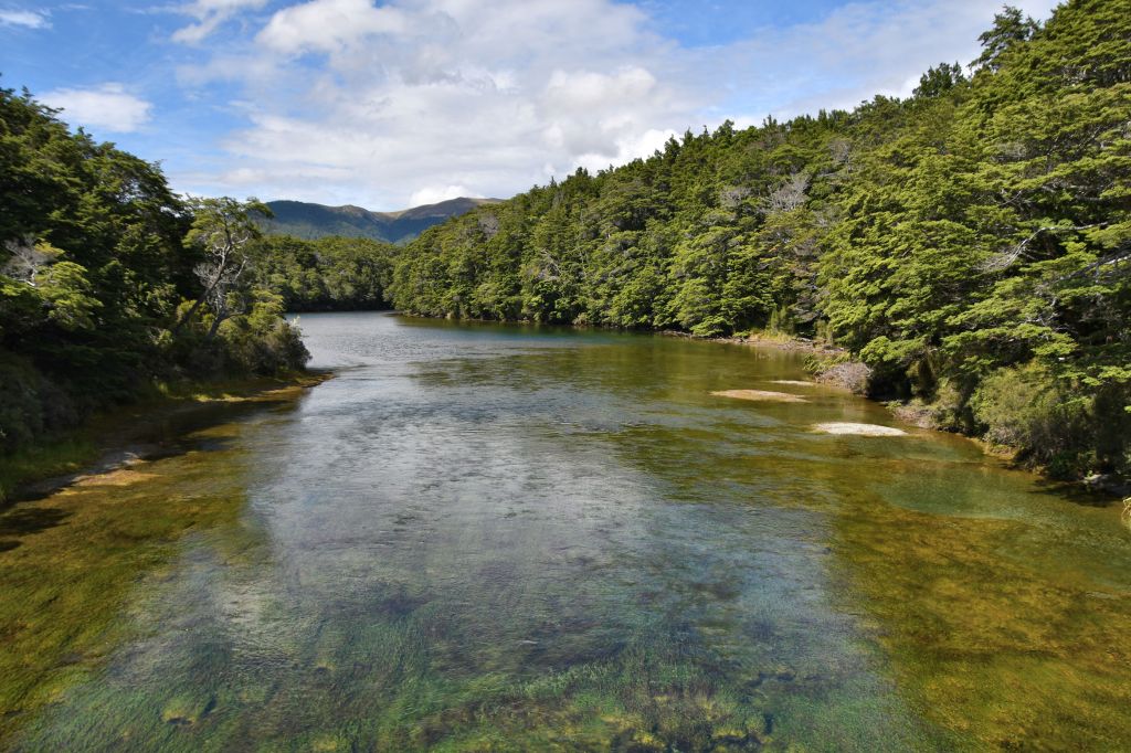 The scenic South Mavora Lake with a small bare patch with no trees on the hillside.