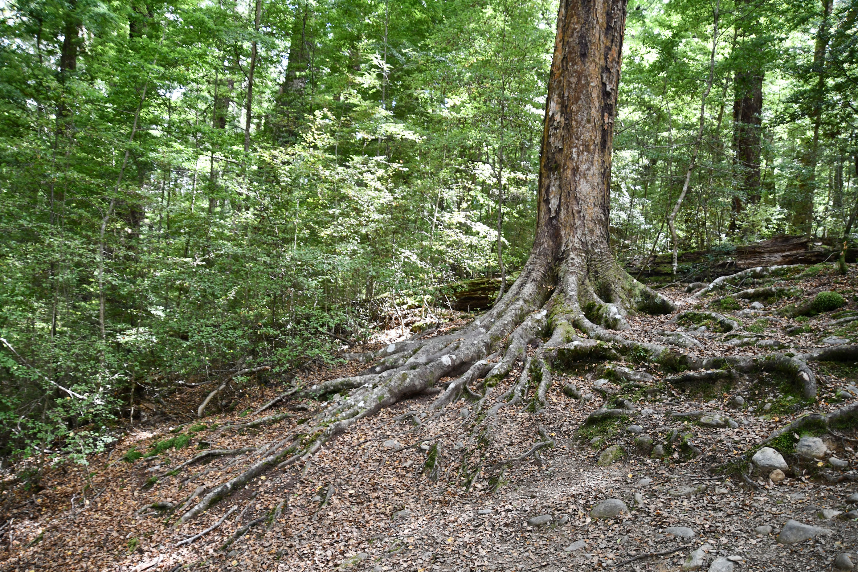 Josh led us first to the tree where Frodo hid from the Urukhai. You can see it there at the top left, where Taylor is lying in between tree roots, and Elise in black at top center, taking the photo.