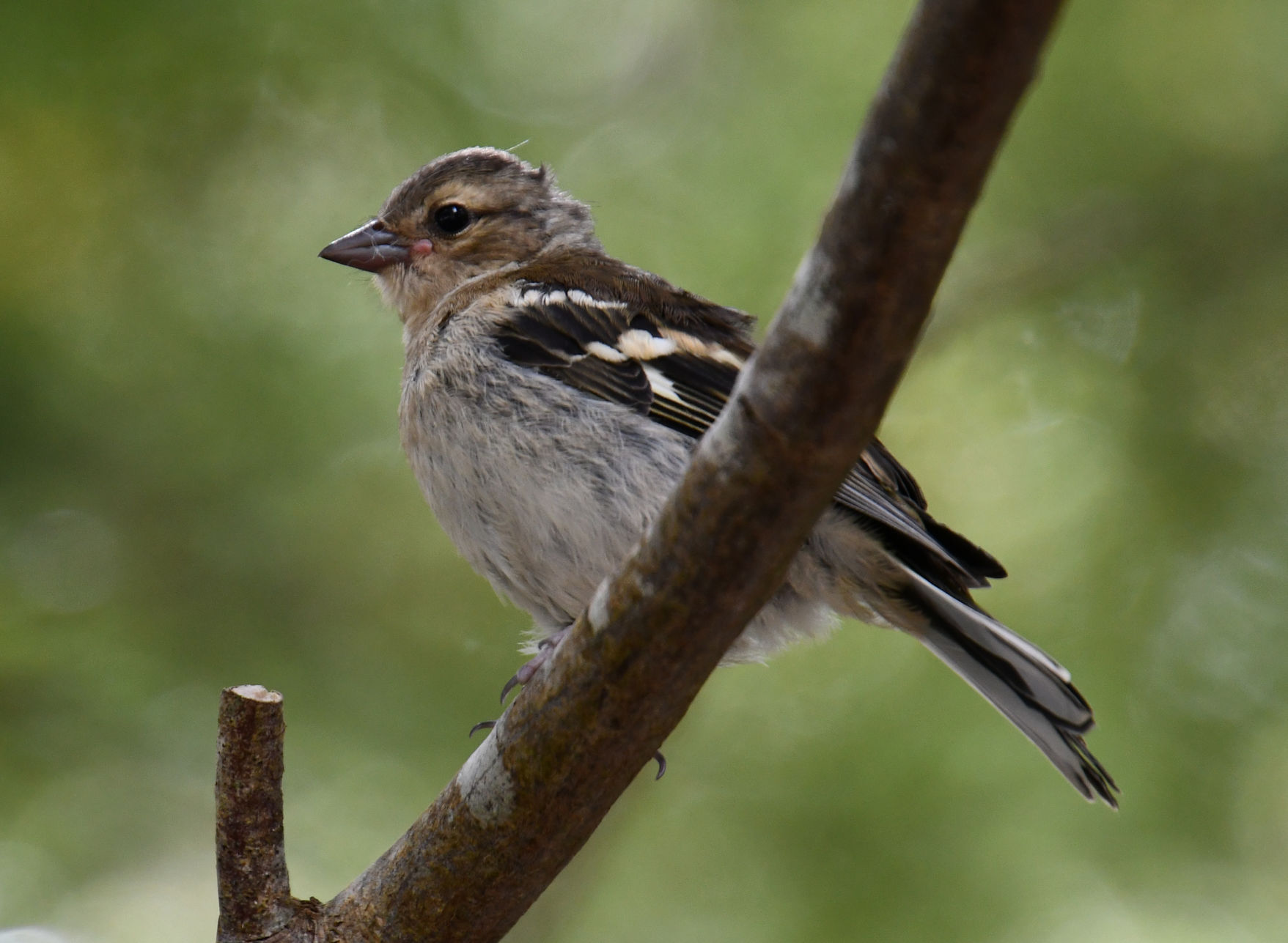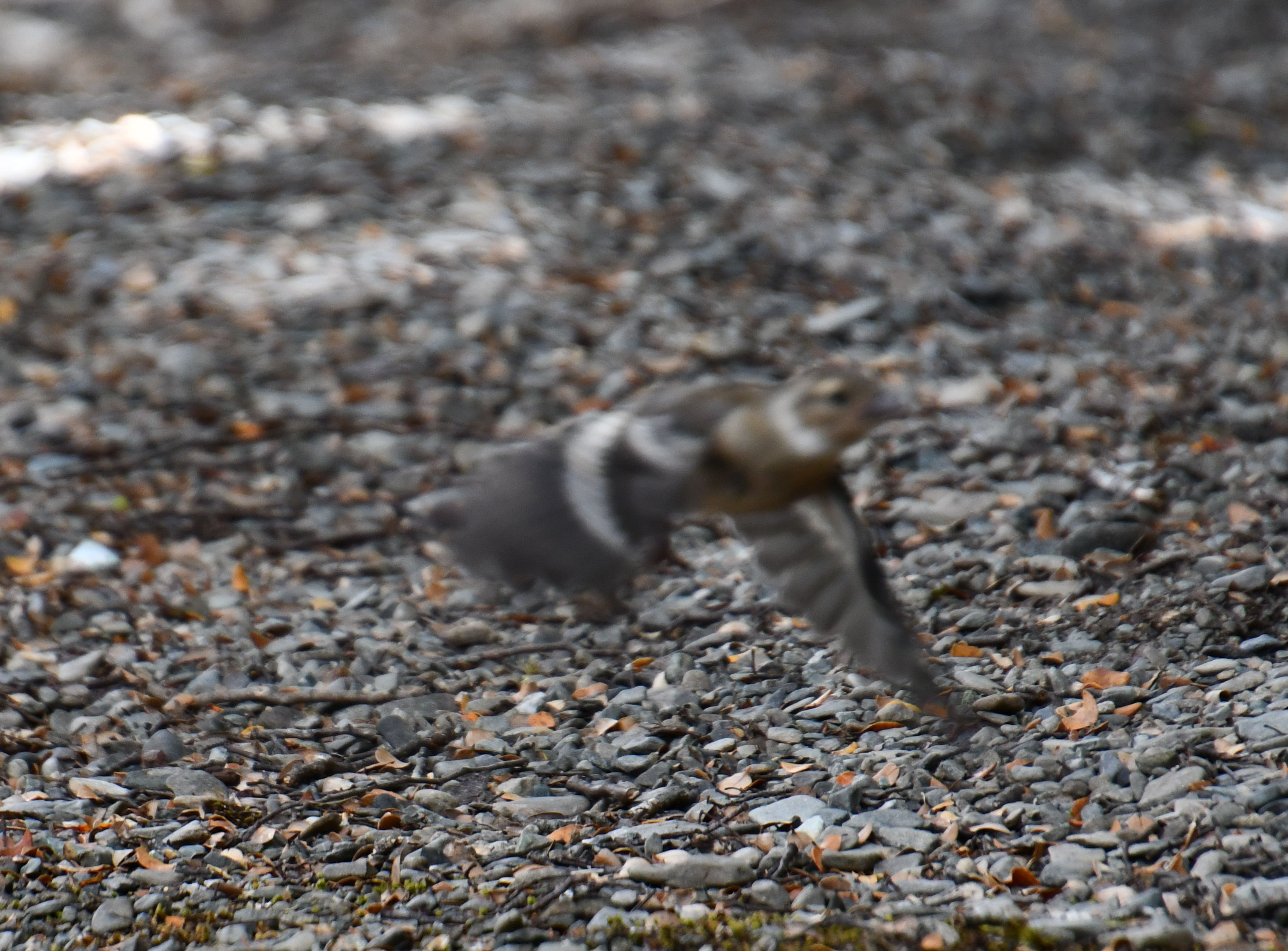The photo on the left is what I saw that caught my attention, with the white neck band and the white streak on the wings, that you can see even though the photo is blurry. Still, on a branch, it looks at first glance like a common sparrow. But that is a finch beak. A female does not have the face and neck markings, and a male is beautifully orange, grey, black and white. Thus…I think this is a juvenile male.