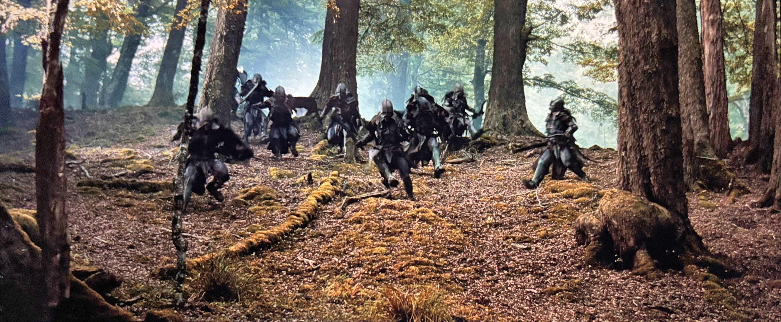 Urukhai in their heavy and restrictive costumes, running down the hill.