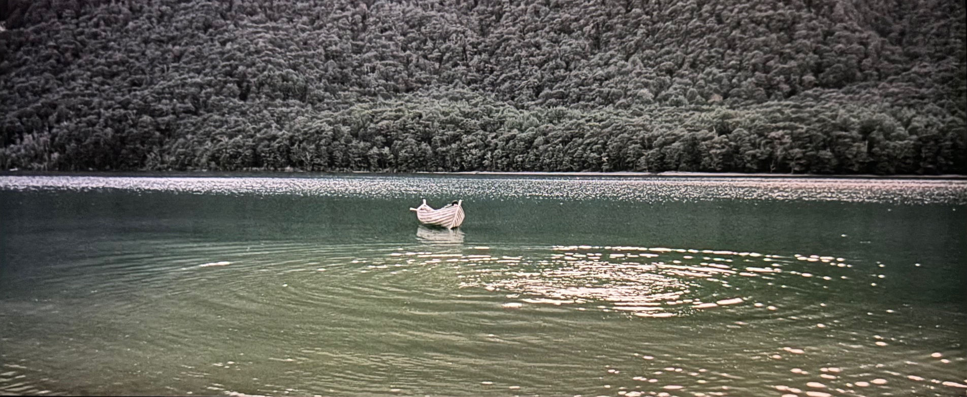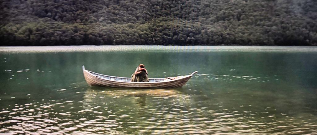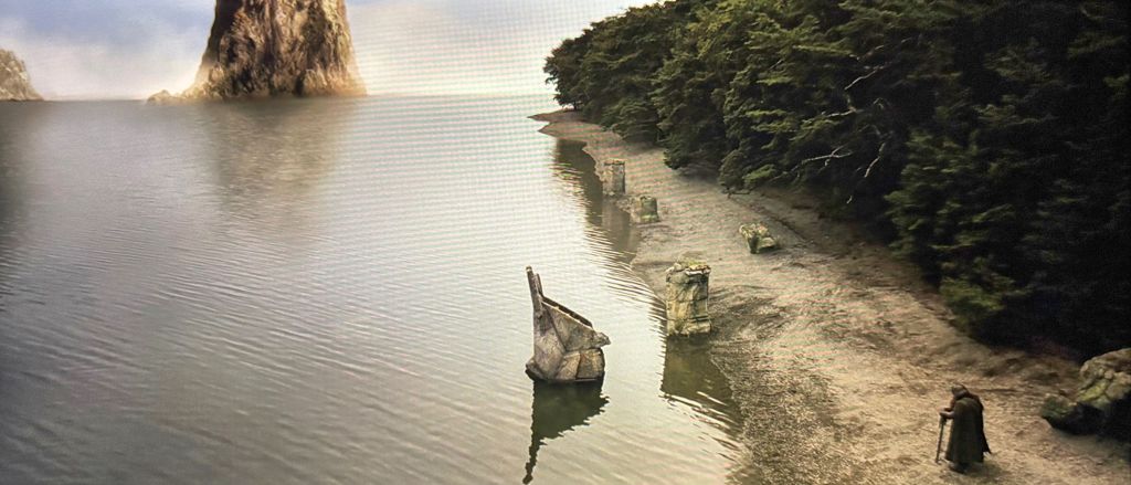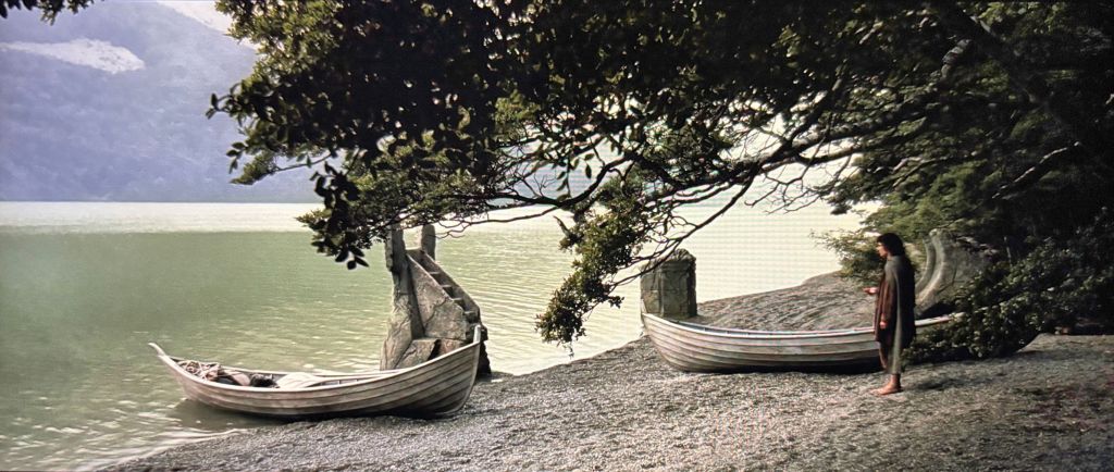 This is the scene with travelers in boats, just as the Fellowship was leaving Lothlorien.