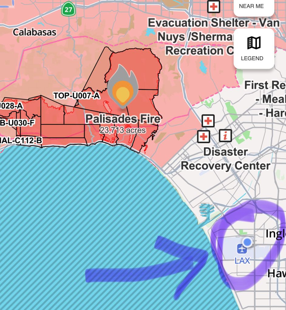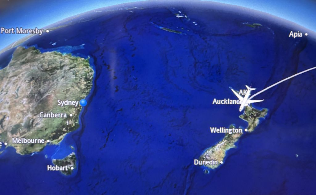 The next morning we took a flight from Queenstown at 8:00 am to Auckland. We left Auckland at 10:30 am for Los Angeles. We checked maps of wildfire boundaries to anticipate any airport problems. Then we settled in for a 12-hour flight across the Pacific Ocean.