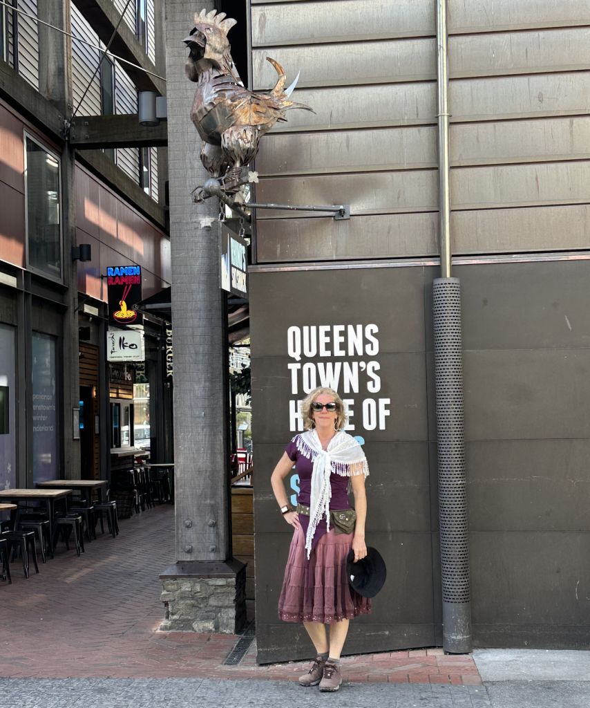 We stopped to photograph this chicken sculpture. Behind you see the Skyline Queenstown.
