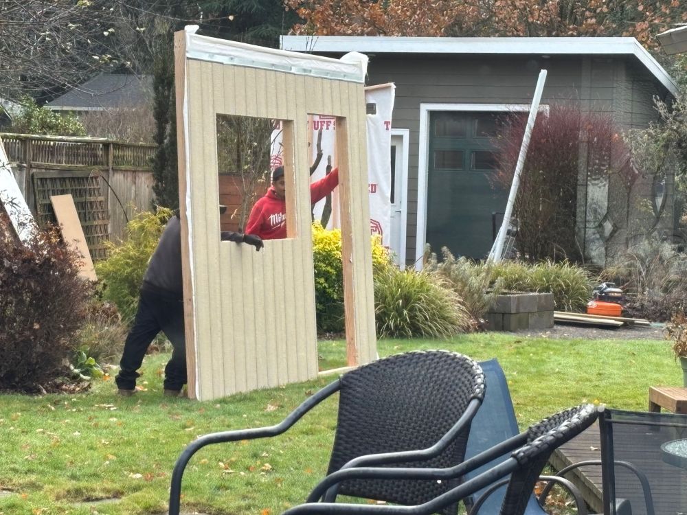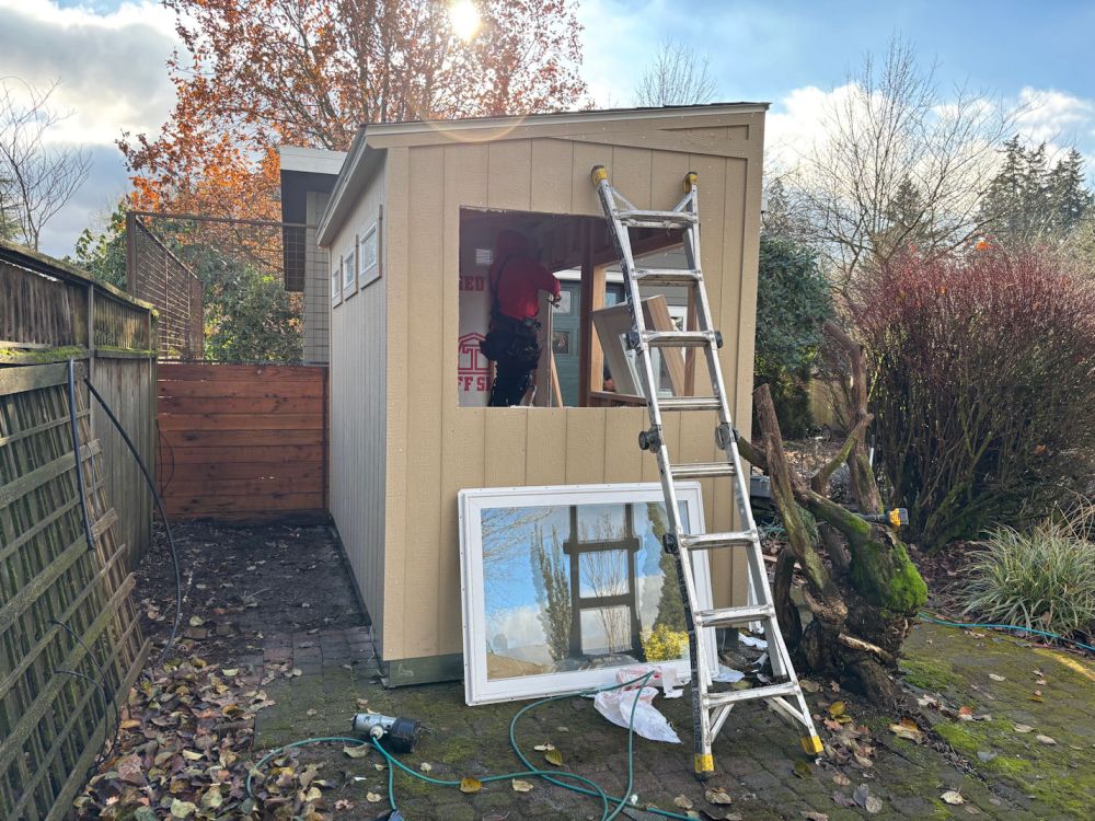 The walls of the structure were pre-built to my order, and hauled to our place on a flatbed truck. Two guys carried all the stuff into the back yard and asked me to confirm where I wanted it. I showed them the space. I was a little concerned about one of the wisteria trunks with a crooked elbow reaching into the construction area. I put my hand on that particular trunk and showed them the way it curved into their work space. “If this (I put my hand on the crook in the trunk) is in your way, it’s ok to cut it back.”