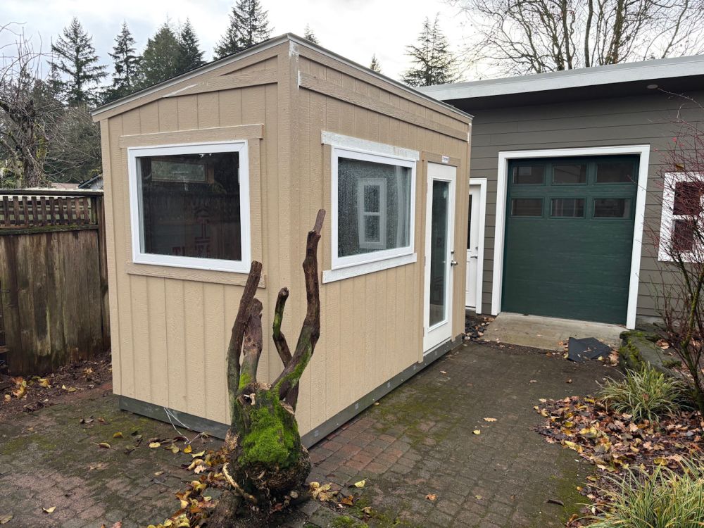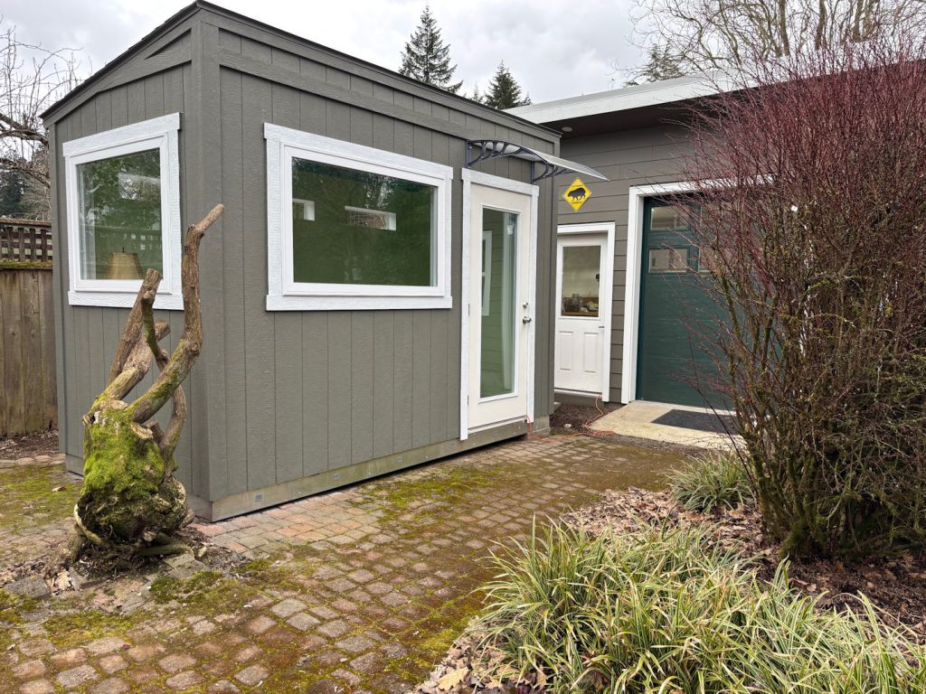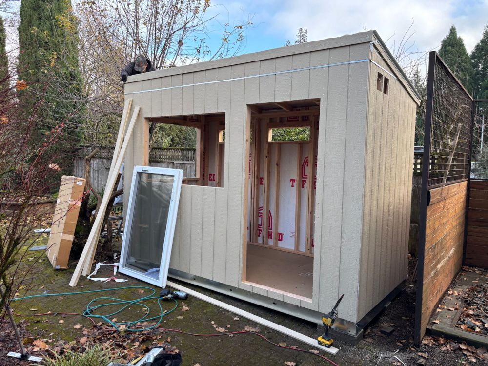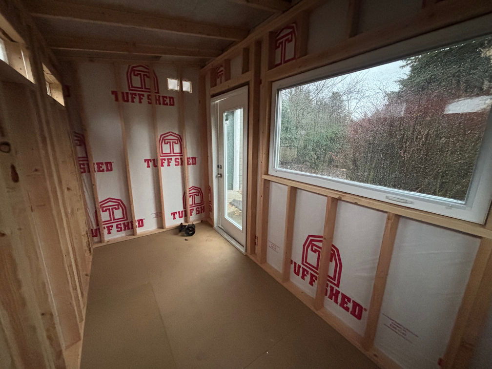 I had special ordered windows and a door to let in as much light as possible. The back wall, which faced a fence, but also looks right onto the neighbor’s house, has small windows that will let in morning sunlight, but not curious gazes. We were pleased that Igor, the electrician who worked on Pedro’s work shop, was willing to do this project as well. He ran power underground from the workshop to the office.