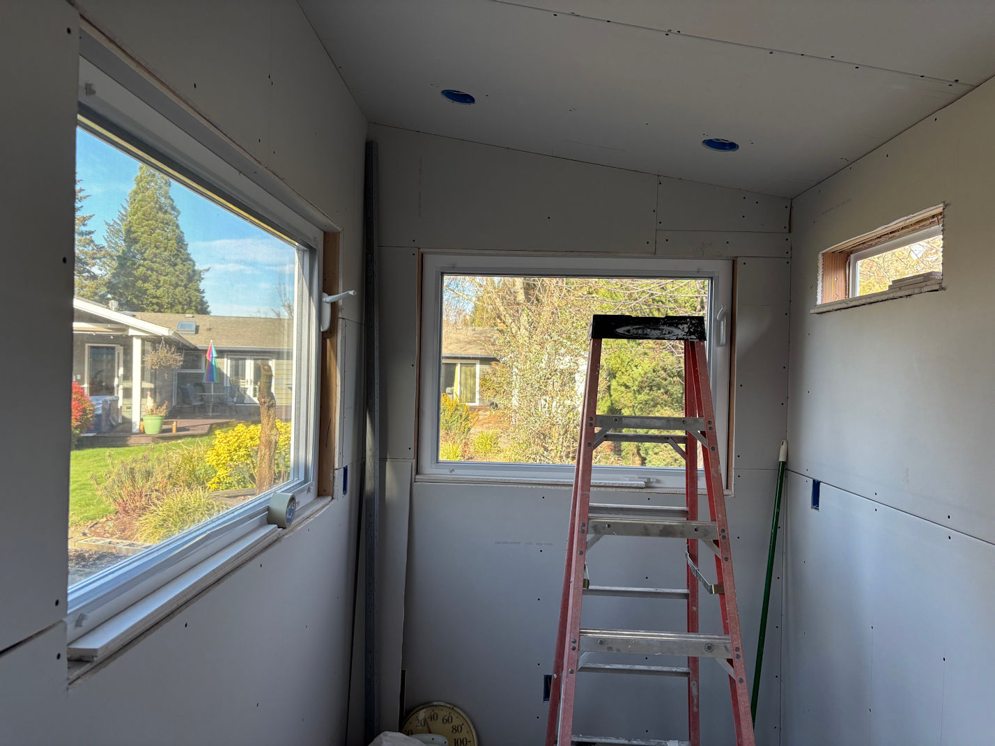 During a frigid but brilliantly sunny week in January, we got the wall and ceiling insulation put up in one day. The sheetrock, then filling and patching and smoothing and then wall texture took three days.