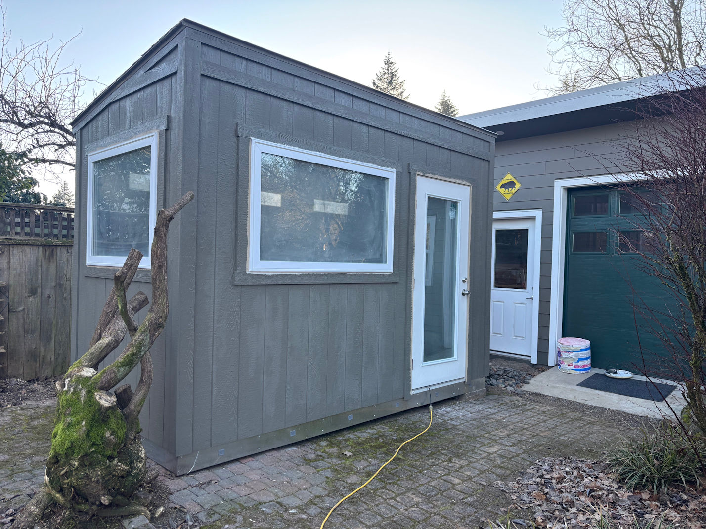 I waited a couple of days for the sheetrock, plaster, and texture to dry, but it was very wet. The temperature outside had been below freezing for most of a week, and the stuff simply wasn’t drying out. So in the last 48 hours before the rains were due to return, I painted the outside of the building to match the main house, and the workshop.