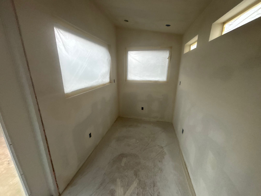 The inside was still sopping wet. A week after the sheetrock was done the walls were still damp. The floor was supposed to go in, but I wanted to paint first. I couldn’t paint until the walls dried. I got desperate and bought a de-humidifer and ran an extension cord out there. Pedro found a little space heater in storage. I ran them alternately for another four days, dumping out cups and cups of water from the dehumidifier. Finally, the walls were dry!