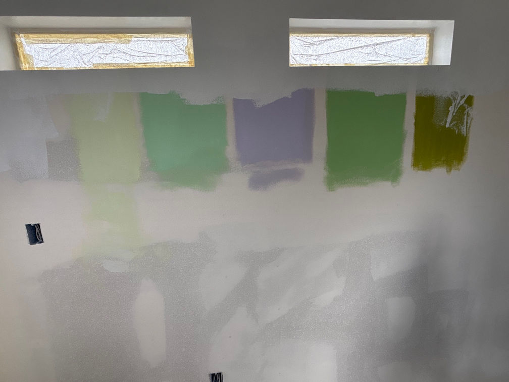 I began with the four colours on the right. Of those four colours, I thought the lighter green (second from the left in the photo above) would be my main wall colour. The rest will be accents on the trim, to make it very colourful in there. Painting patches on the wall before I commit allows me a better sense of how it will look. This time, that green I thought I wanted made me think of a hospital, which was no good. That’s when I picked up the colour on the far left.