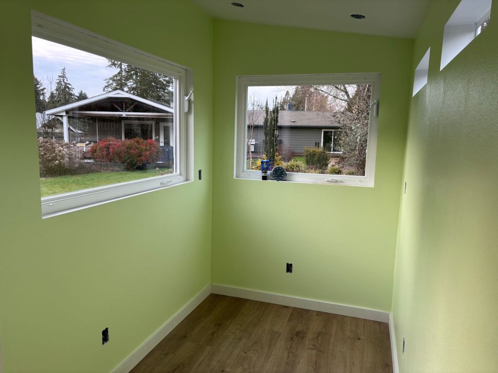 After two coats in the corners using a brush, I switched to a roller and a pan, and put two coats on the walls. Each time I put on more paint, the windows instantly fogged up and I had to run the dehumidifier again. In the photo above, you see paper towels in the windowsill, where I was sopping up the condensation. I alternated the space heater and dehumidfier for a few more days, then told the contractor it was finally ready for a floor.