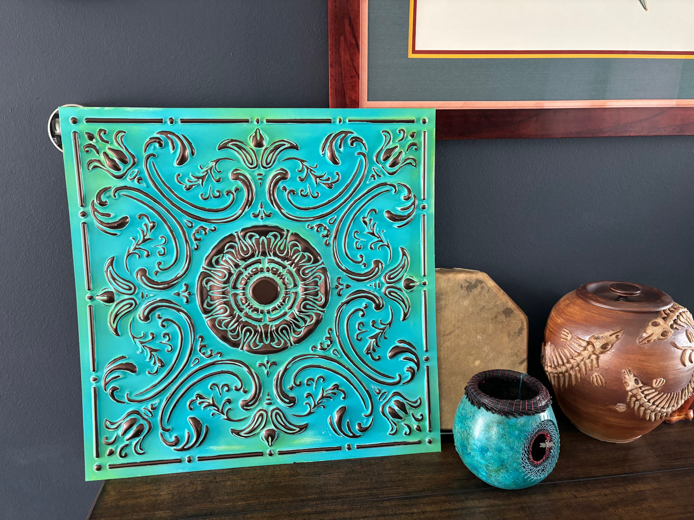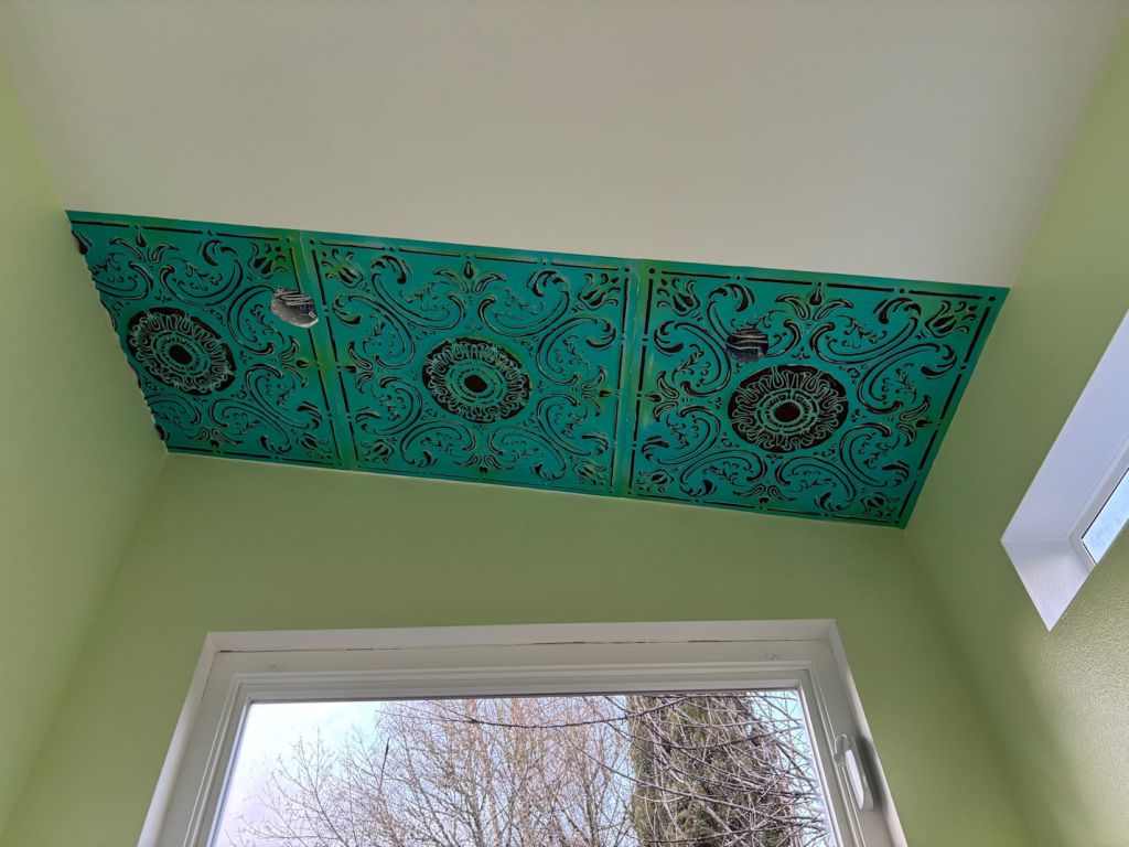 I had no idea these things were still sold. They are not metal, as the vintage ceilings in historic buildings are made of. These are plastic! They are shaped with scissors. They are affixed with glue. I could hardly believe how easy that sounded. And it ended up being so easy. I began one evening around 4 pm and after gathering all my supplies and figuring out how to get going, I finished only three tiles before it was too dark to work.