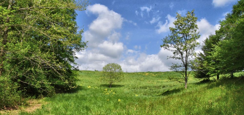 A huge pile of tires fascinated and disgusted me. Then I realized there was a large open space just beyond the tires. I crashed through the underbrush getting snagged on thorns, and climbed out of the forest to see: