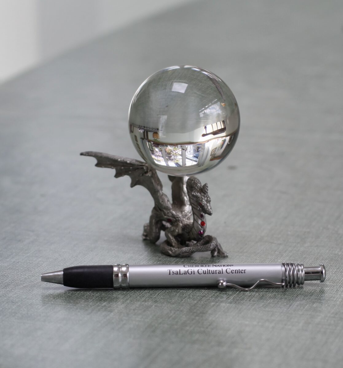 In the garden our second night, I remembered to bring my own gifts. A pen from the Cherokee Nation, with an embedded scroll containing the Cherokee language syllabary and Cherokee words and phrases to use, so next time I visit, Derrick and I can speak in Cherokee. Just kidding! I only know a few words. For the other gift, I had to bring a dragon, because dragons are my familiar. I thought the glass ball would look lovely in the dragon garden, but they are worried for its safety. I’m sure the dragon appreciates this care.
