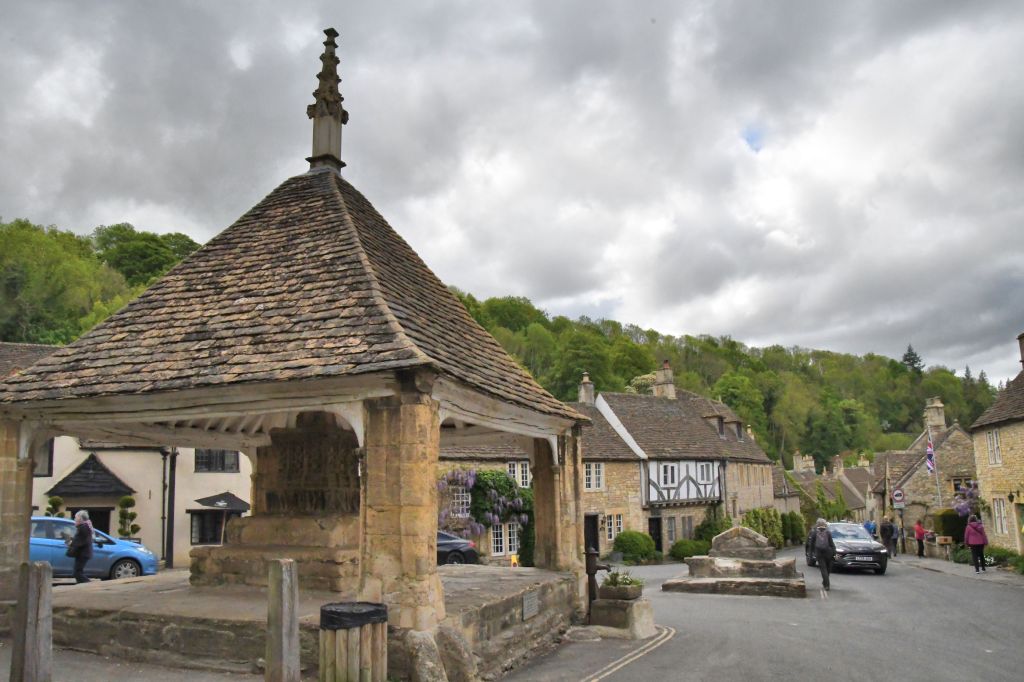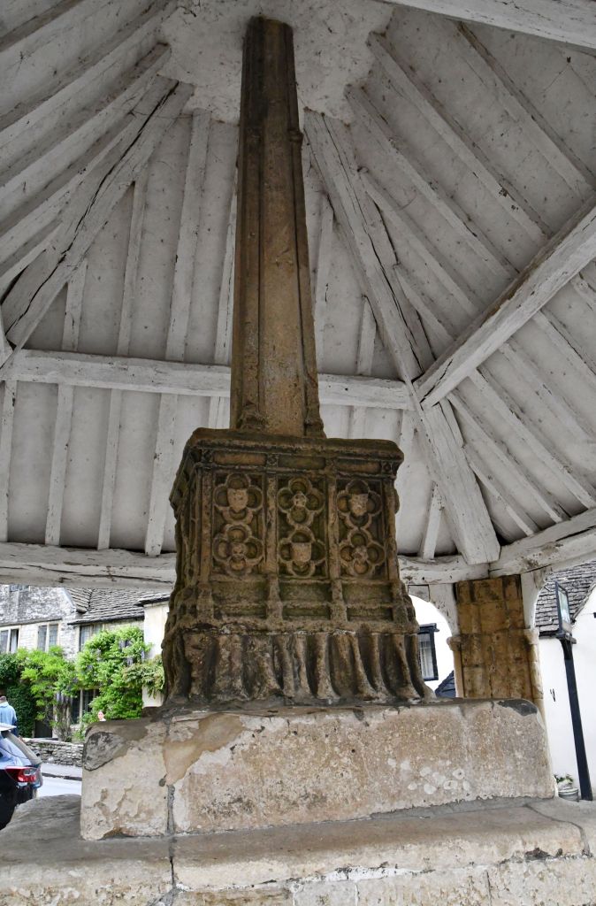 The market cross, at the intersection in the center of Castle Combe, and a large stone near it.