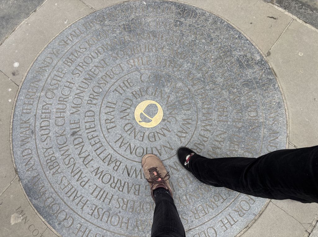 Sculptor Iain Cotton created a marker placed in front of Bath Abbey in 2012. The stone features place names from along the route and a quote from Jeremiah 6:16. “Stand ye in the ways and see, ask for the old paths, where is the good way, and walk therein, and ye shall find rest for your souls.” It’s sister marker is at Chipping Campden and together they bookend the Cotswold Way walking route.