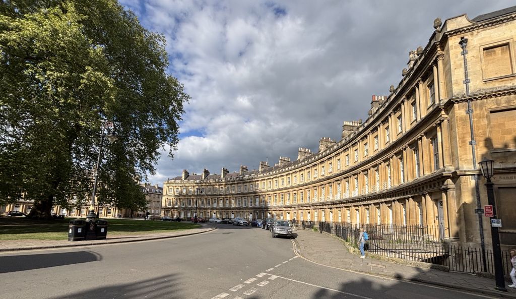 It was an easy walk from there to the adjacent Royal Crescent, designed and built by John Wood the Younger. Even at the end of a long day of being impressed by architecture, The Royal Crescent still elicited exhales of admiration. Unlike The Circle with its magnificent trees in the center, blocking views of the buildings, here we saw a sweeping arc of stunning Georgian stone townhouses hugging an expansive green lawn.