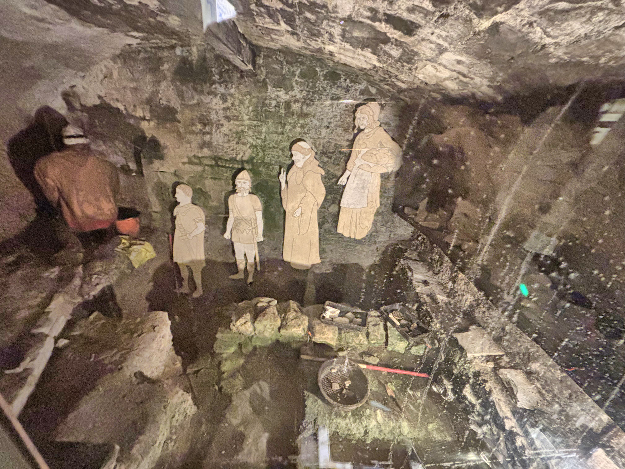 After circling a bit, we found the place, and at the same time found a line stretching out the door and into the street. As we stood there, I noticed instructions on a sign that said for people only interested in the tiny museum, they could push past the line and get inside. So we did that, passing a line of people in a narrow hall waiting to be seated, and then walking down flights of stairs to a tiny below-ground museum.