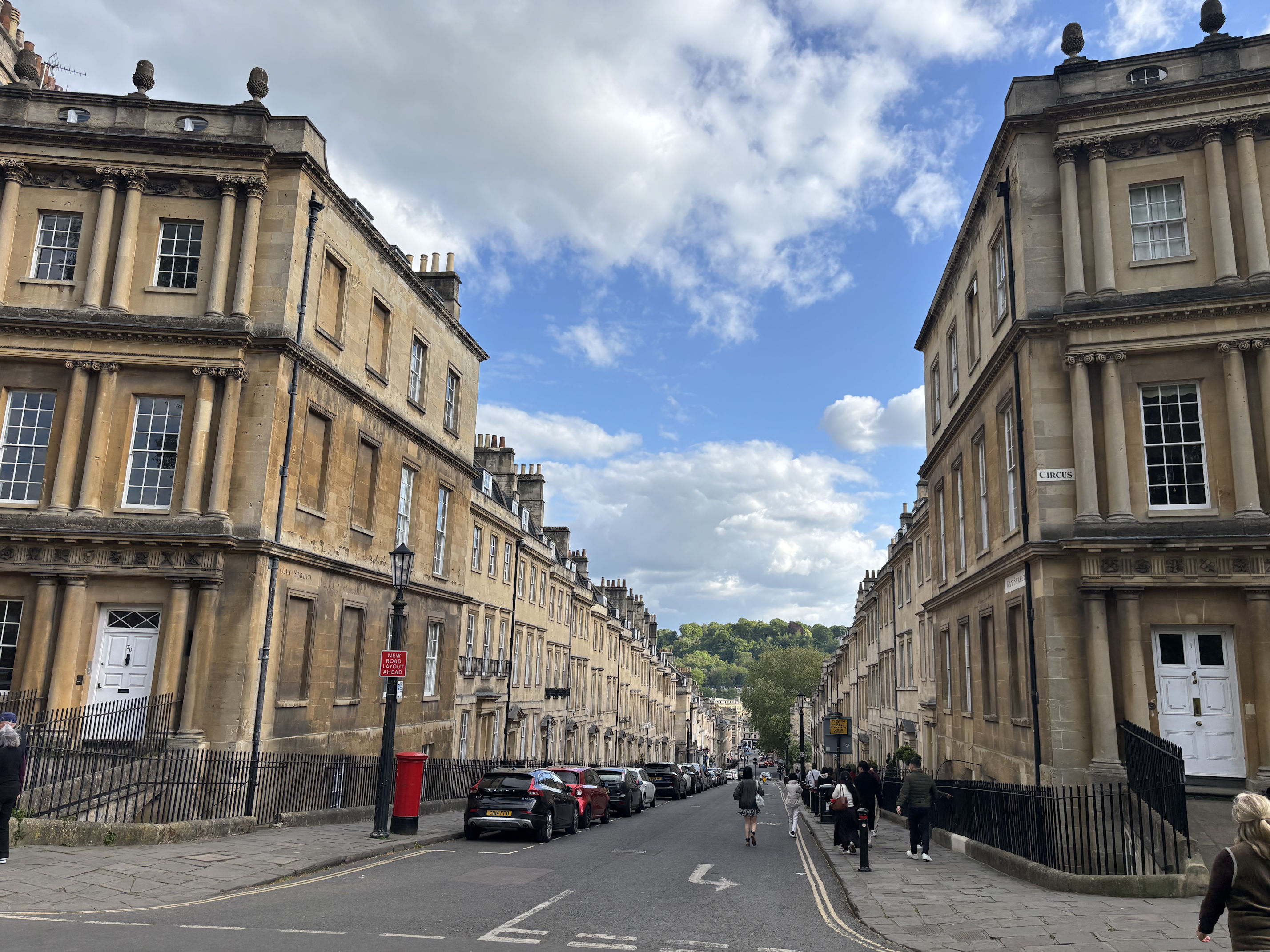 We then reversed course and began walking uphill to more of Bath’s famous structures, including The Circus, and The Royal Crescent. Before writing this post I didn’t really know what Georgian architecture was, but after looking at all these photos, I have a sense of it. One marvelous example is The Circus, a 360-degree masterclass in design, is the work of John Wood the Elder. The architect was so inspired by Stonehenge that he designed The Circle with similar diameter. Like all Georgian structures, it hearkens to classical Roman architecture. This was his last magnificent project and John Wood died only three months after construction began, leaving his son, John Wood the Younger to finish it.