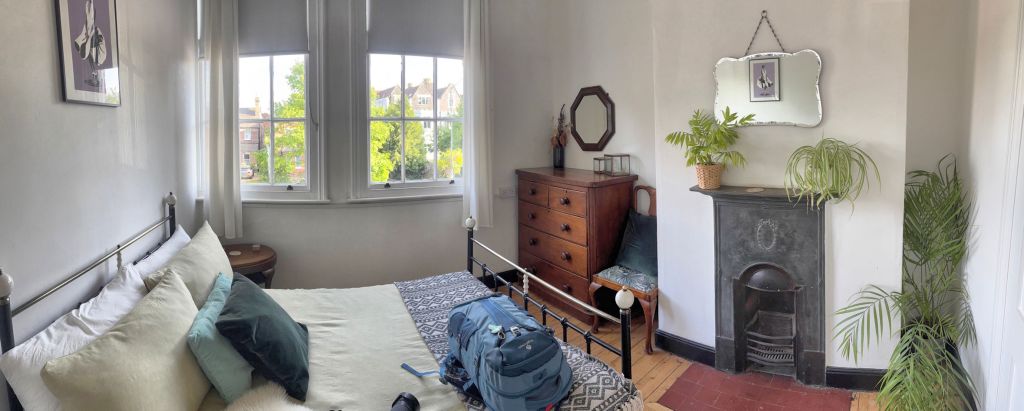 We dropped our things and went over to Sainsbury’s market to buy some food to eat. The host had put fresh milk and a fresh loaf of bread in the kitchen for us. We ate fruit, cheese, and bread and wine in the comfortable and welcoming front room till we were sated and rested.