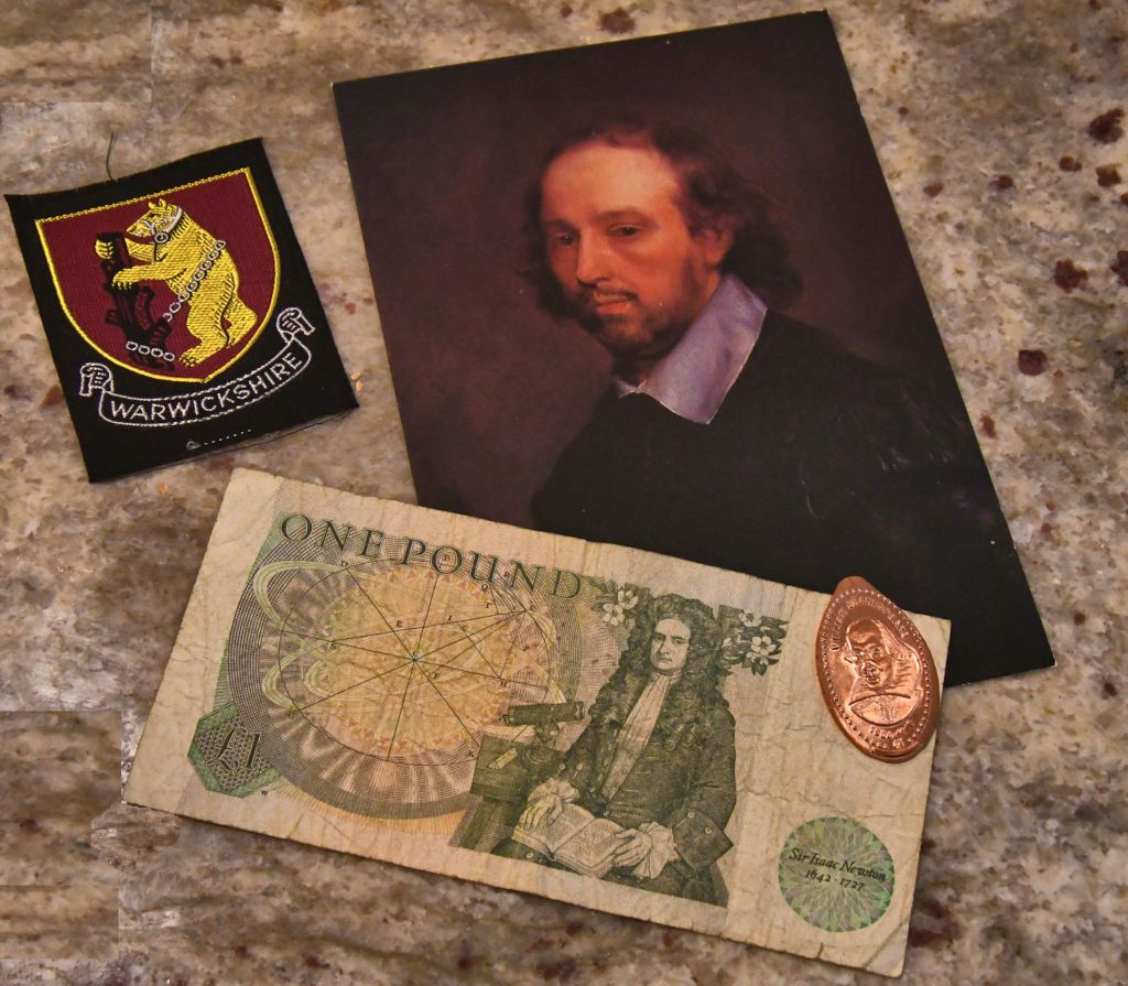 I gave Andrew the same gift I gave to Derrick: a Cherokee Nation pen with a pull-out scroll containing the syllabary of the Cherokee language and some example phrases. His gifts to me were more substantial, and all on theme! He brought a book from one of my favourite authors, Bill Bryson, about Shakespeare, and two postcards from Mary Arden’s farm and a painting of the Bard. He also gifted an old version of a banknote – a perfect gift for me, since I collect currency and particularly like old currency. And he also brought an old school patch, with the “bear and ragged staff,” he said. It was the first time I had heard that phrase, and then Margaret and I spotted a statue of it later that day.