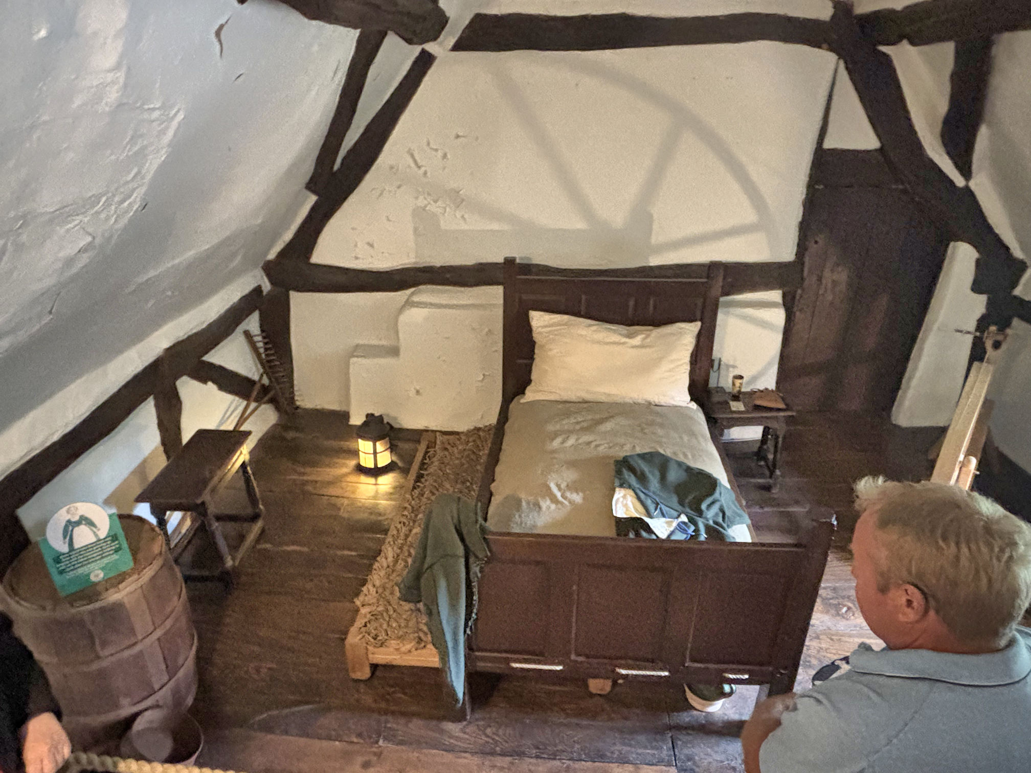 Back we went to Stratford, where, on the outskirts of town we arrived at Anne Hathaway’s cottage. For as much as people love this family, there isn’t much known of them. Records were slim then, and no one at the time knew that in 2025 we would still be fascinated with all things Willie. Rumors have spun about the bad marriage between Will and his wife Anne, based on speculation using incomplete data. The playwright spent a lot of time working in London, and left his wife and children behind, which made him seem like he was neglectful and maybe didn’t even want to be home. Furthermore, in his will, he specifically left his “second best bed” to his wife, which seemed like a hurtful slight to some.
