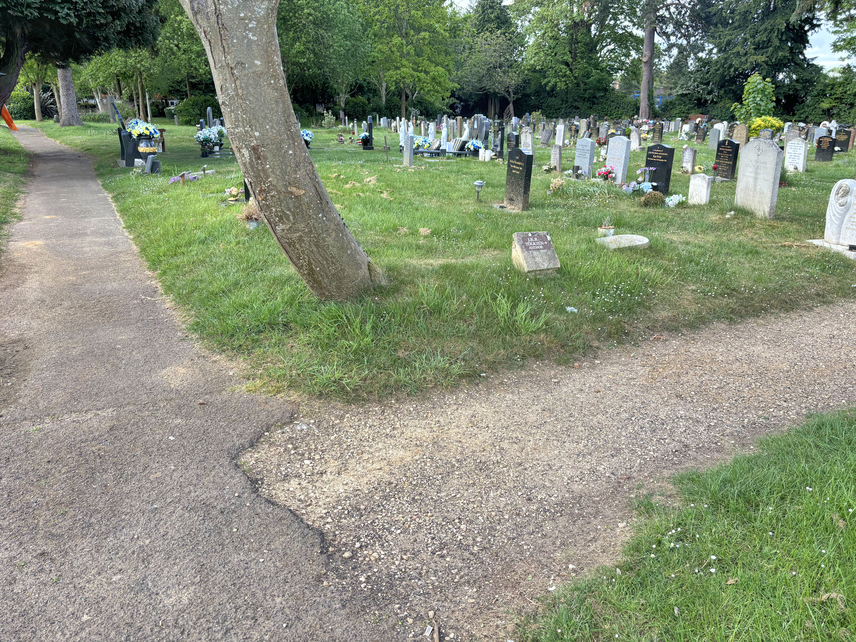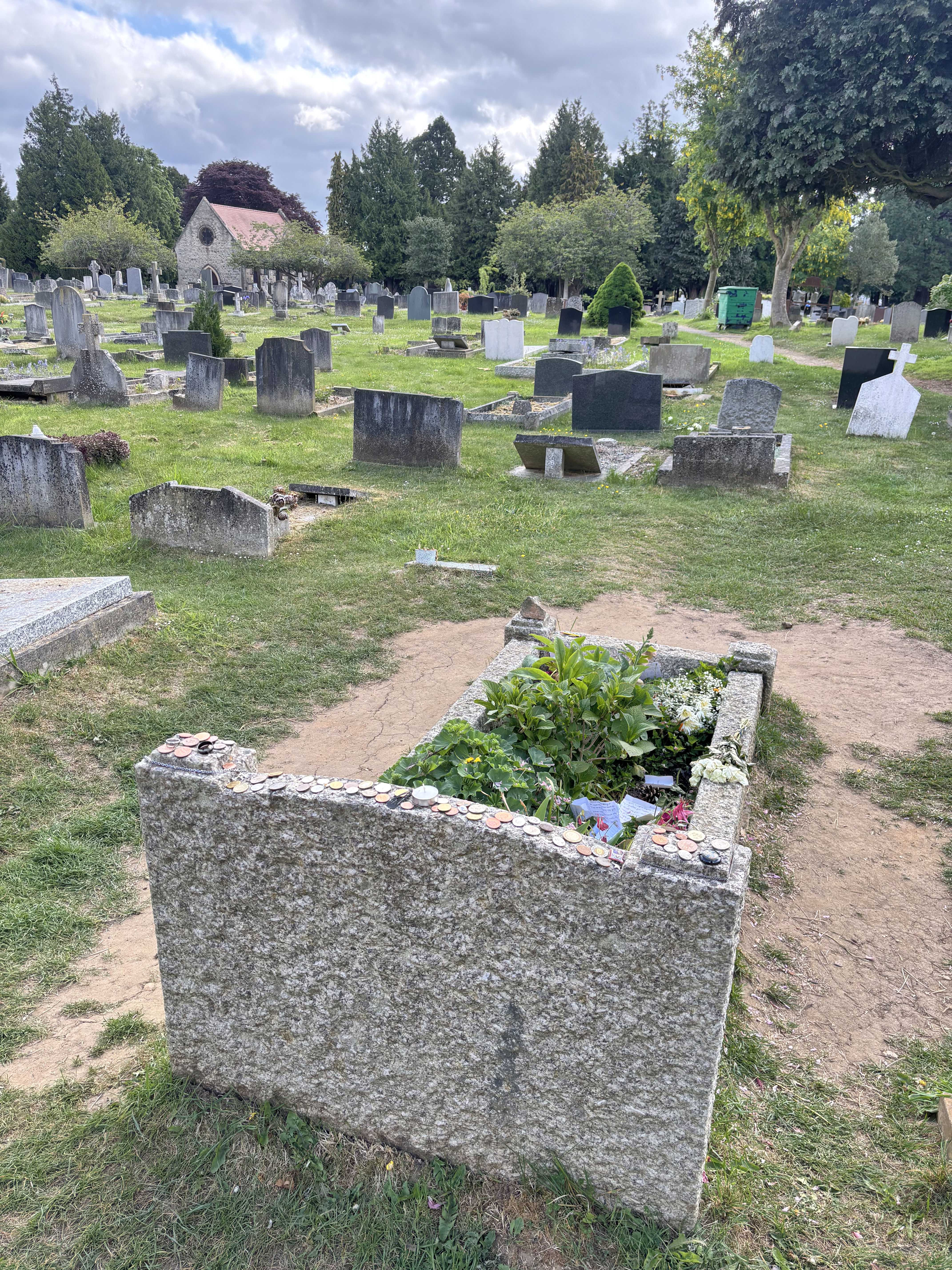 We found the Wolvercote Cemetery with very little effort. It was hardly out of our way, and thus convenient, as we traveled south to the airport. The problem, then, was …which grave? I read on Atlas Obscura that there were signs to help, but we saw none. There was no reference to Tolkien on any notices posted near the chapel-like building in the center.