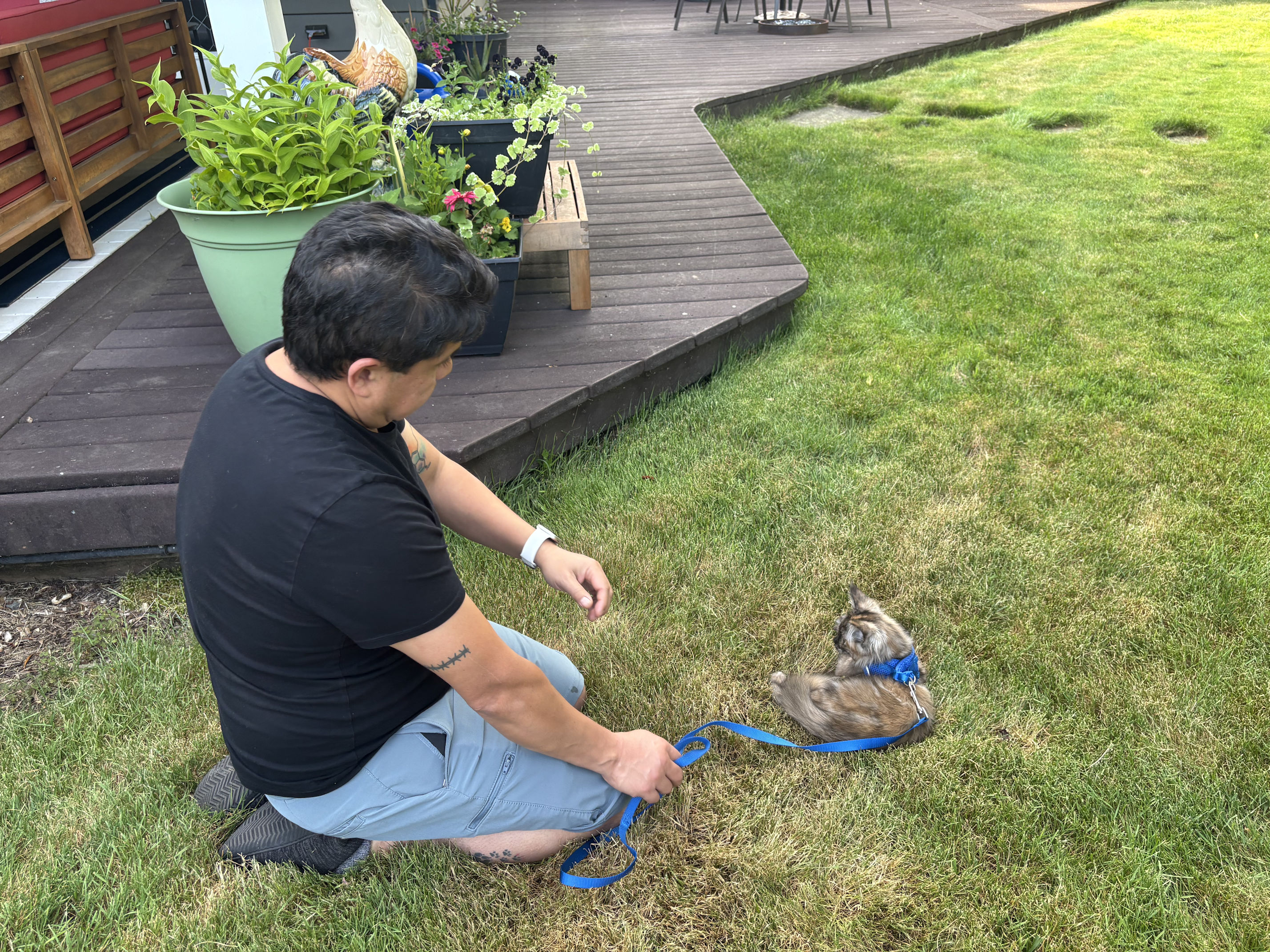 She is getting better with the harness, and I think that will improve as she gets larger and fits it better. She still spends the first few minutes in the harness adjusting to how it feels. Usually limping, which I think is so funny, because she’s not hurt, just confused. Yes, I’m trying to enjoy the messes for what they are – just proof that we have an energetic kitten, doing what she is supposed to be doing.